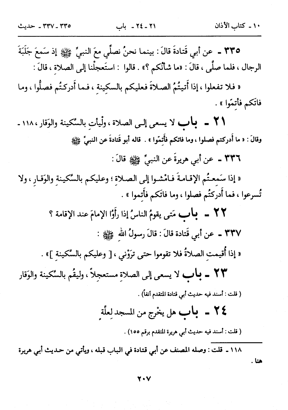 21 - باب لا يسعى إلى الصلاة، ولْيأتِ بالسَّكينة والوَقار، 118 - وقالَ: "ما أَدركتم فصلوا، وما فاتكم فأَتِمّوا". قاله أبو قَتادةَ عن النبيِّ - صلى الله عليه وسلم -