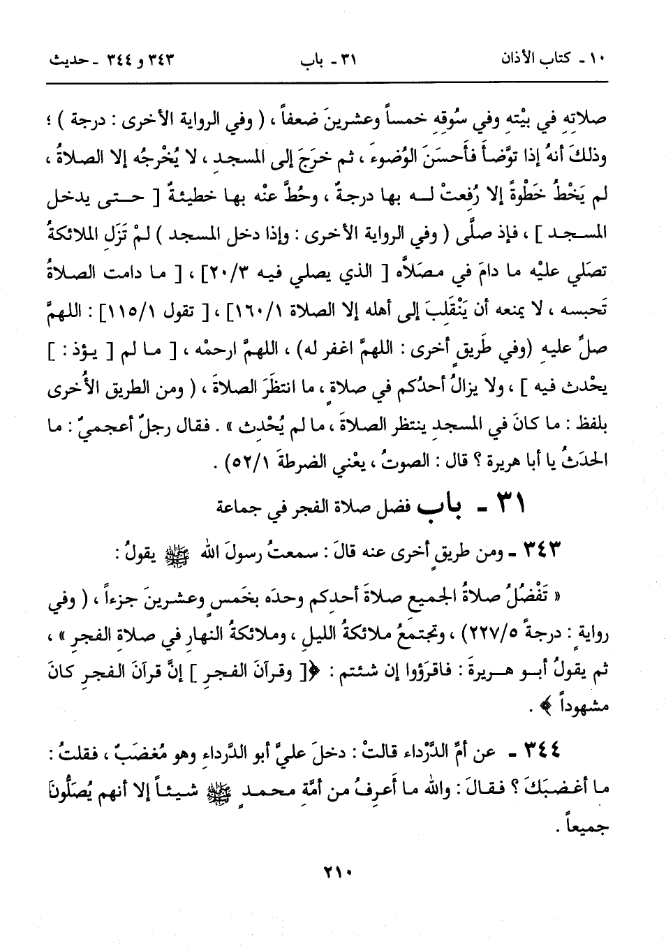 صلاتِهِ في بيْتهِ وفي سُوقِهِ خمساً وعشرينَ ضعفاً، (وفي الرواية الأخرى: درجة)؛ وذلكَ أنهُ إذا توضَّأَ فأَحسَنَ الوُضوءَ، ثم خرَجَ إلى المسجدِ، لا يُخْرجُه إلا الصلاةُ، لم يَخْطُ خَطْوةً إلا رُفِعتْ له بها درجةٌ، وحُطَّ عنْه بها خطيئةٌ [حتى يدخل المسجد]، فإذا صلَّى (وفي الرواية الأخرى: وإذا دخل المسجد) لمْ تَزَلِ الملائكةُ تصَلي عليْه ما دامَ في مصَلاَّه [الذي يصلي فيه 3/ 20]، [ما دامت الصلاةُ تَحبسه، لا يمنعه أن يَنْقَلِبَ إلى أهله إلا الصلاة 1/ 160]، [تقول 1/ 115]: اللهمَّ صلِّ عليهِ (وفي طَريقٍ أخرى: اللهمَّ اغفر له)، اللهمَّ ارحمْه، [ما لم [يؤذ:] يحْدث فيه]، ولا يزالُ أحدُكم في صلاةٍ، ما انتظَرَ الصلاةَ، (ومن الطريق الأُخرى بلفظ: ما كانَ في المسجدِ ينتظر الصلاةَ، ما لم يُحْدِث". فقال رجلٌ أعجميٌ: ما الحدَثُ يا أبا هريرة؟ قال: الصوتُ، يعْني الضرطةَ 1/ 52).