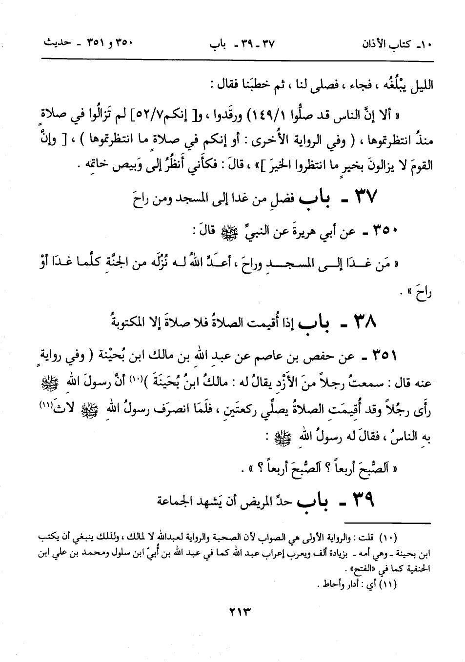 (10) قلت: والرواية الأولى هي الصواب لأن الصحبة والرواية لعبد الله لا لمالك، ولذلك ينبغي أن يكتب ابن بحينة - وهي أمه - بزيادة ألف ويعرب إعراب عبد الله كما في عبد الله بن أبيّ ابن سلول ومحمد بن علي ابن الحنفية كما في "الفتح".