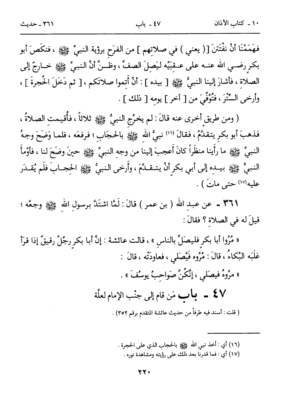 (ومن طريقٍ أخرى عنه قالَ: لم يخرُجِ النبيُّ - صلى الله عليه وسلم - ثلاثاً، فأُقيمتِ الصلاةُ، فذهبَ أبو بكرِ يتقدَّمُ، فقالَ (16) نبيُّ اللهِ - صلى الله عليه وسلم - بالحجَابِ، فرفعَه، فلما وَضَحَ وجهُ النبيِّ - صلى الله عليه وسلم - ما رأَينا منظَراً كانَ أَعجبَ إلينا من وجهِ النبيِّ - صلى الله عليه وسلم - حينَ وضَحَ لنا، فأوْمأَ النبيُّ - صلى الله عليه وسلم - بيدِه إلى أبي بكرٍ أنْ يتقدَّمَ، وأَرخى النبيُّ - صلى الله عليه وسلم - الحِجاب فلَم يُقدَر عليه (17) حتى ماتَ).