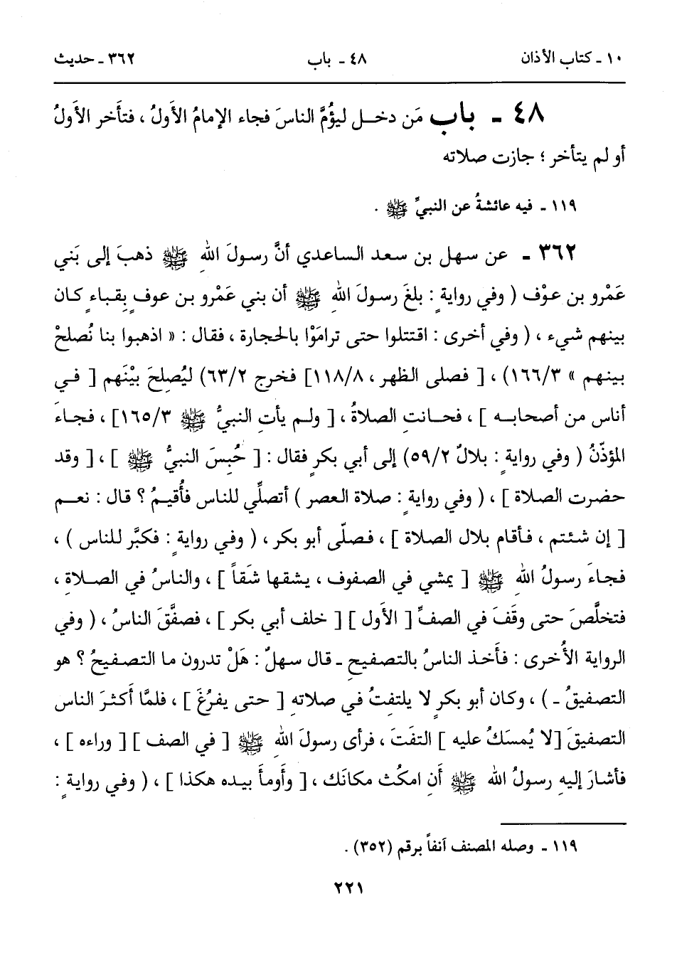 362 - عن سهل بن سعد الساعدي أنَّ رسولَ اللهِ - صلى الله عليه وسلم - ذهبَ إلى بَني عَمْرو بن عوْف (وفي روايةٍ: بلغَ رسولَ اللهِ - صلى الله عليه وسلم - أن بني عَمْرو بن عوفٍ بِقباءٍ كان بينهم شيء، (وفي أخرى: اقتتلوا حتى ترامَوْا بالحجارة، فقال: "اذهبوا بنا نُصلحْ بينهم" 3/ 166)، [فصلى الظهر، 8/ 118] فخرج 2/ 63) ليُصِلحَ بيْنَهم [في أناس من أصحابه]، فحانتِ الصلاةُ، [ولم يأتِ النبيُّ - صلى الله عليه وسلم - 3/ 165]، فجاءَ المؤذّنُ (وفي روايةٍ: بلالٌ 2/ 59) إلى أبي بكرٍ فقال: [حُبِسَ النبيُّ - صلى الله عليه وسلم -]، [وقد حضرت الصلاة]، (وفي روايةٍ: صلاة العصر) أتصلِّي للناس فأُقيمُ؟ قال: نعم [إن شئتم، فأقام بلال الصلاة]، فصلّى أبو بكر، (وفي روايةٍ: فكبَّر للناس)، فجاءَ رسولُ اللهِ - صلى الله عليه وسلم -[يمشي في الصفوف، يشقها شَقاً]، والناسُ في الصلاةِ، فتخلَّصَ حتى وقَفَ في الصفِّ [الأَول] [خلف أبي بكر]، فصفَّقَ الناسُ، (وفي الرواية الأُخرى: فأَخذ الناسُ بالتصفيحِ - قال سهلٌ: هَلْ تدرون ما التصفيحُ؟ هو التصفيقُ -)، وكان أبو بكرٍ لا يلتفِتُ في صلاتهِ [حتى يفرُغَ]، فلمَّا أَكثرَ الناس التصفيقَ [لا يُمسَكُ عليه] التفَتَ، فرأى رسولَ الله - صلى الله عليه وسلم -[في الصف] [وراءه]، فأشارَ إليهِ رسولُ الله - صلى الله عليه وسلم - أَنِ امكُث مكانَك، [وأَومأَ بيده هكذا]، (وفي روايةٍ: