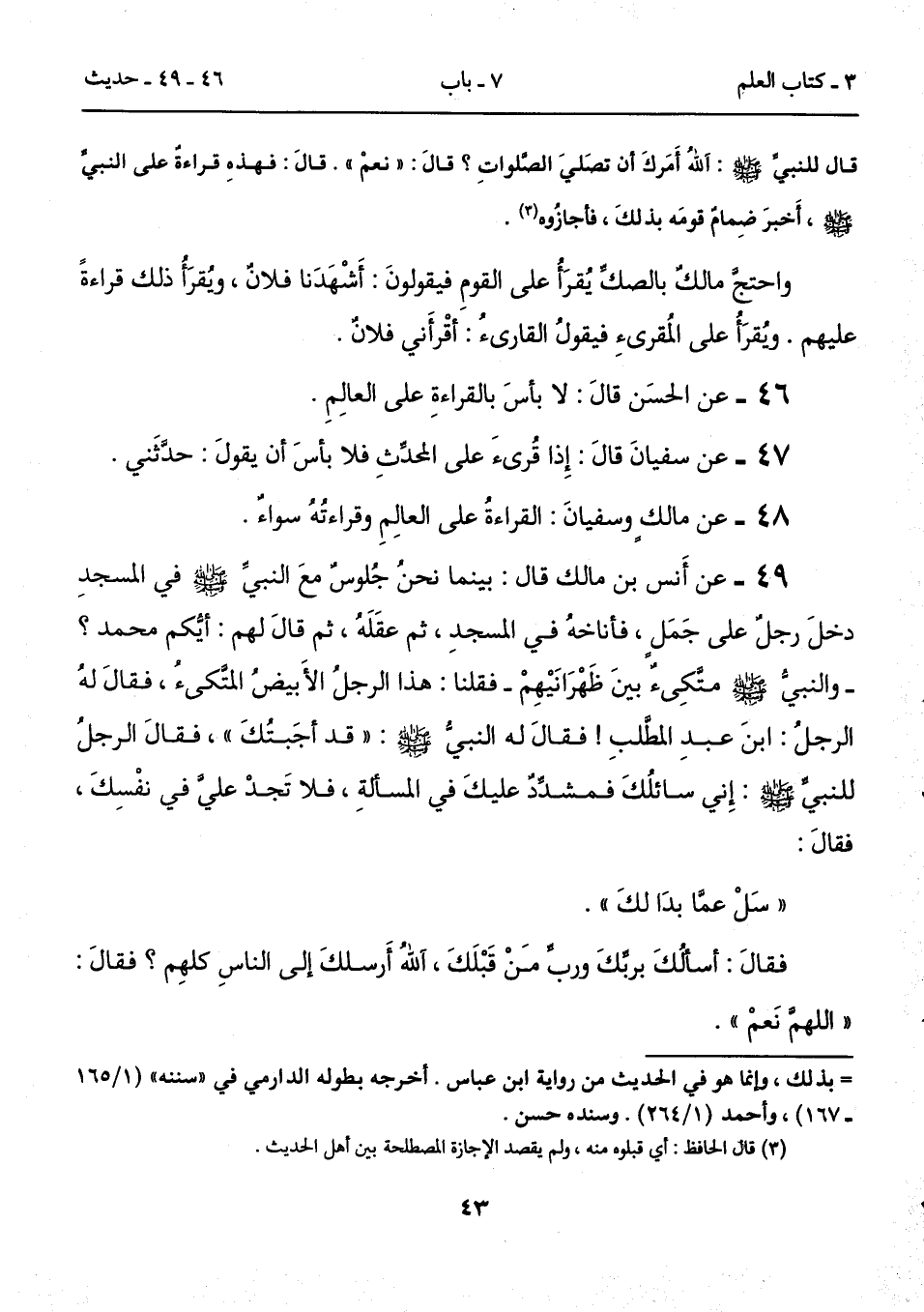 49 - عن أَنس بن مالك قال: بينما نحنُ جُلوسٌ معَ النبيِّ - صلى الله عليه وسلم - في المسجدِ دخلَ رجلٌ على جَمَلٍ، فأناخهُ في المسجدِ، ثم عقَلَهُ، ثم قالَ لهم: أيُّكم محمد؟ - والنبيُّ - صلى الله عليه وسلم - متَّكِىءٌ بينَ ظَهْرَانَيْهِمْ- فقلنا: هذا الرجلُ الأَبيضُ المتَّكىءُ، فقالَ لهُ الرجلُ: ابنَ عبدِ المطَّلبِ! فقالَ له النبيُّ - صلى الله عليه وسلم -: "قد أجَبتُكَ"، فقالَ الرجلُ للنبى - صلى الله عليه وسلم -: إِني سائلُكَ فمشدِّدٌ عليكَ في المسألةِ، فلا تَجدْ عليَّ في نفْسِكَ، فقالَ: " سَلْ عمَّا بدَا لكَ". فقالَ: أسالُكَ بربِّكَ وربِّ مَنْ قَبْلَكَ، آللهُ أَرسلكَ إلى الناسِ كلهِم؟ فقالَ: " اللهمَّ نَعمْ ".