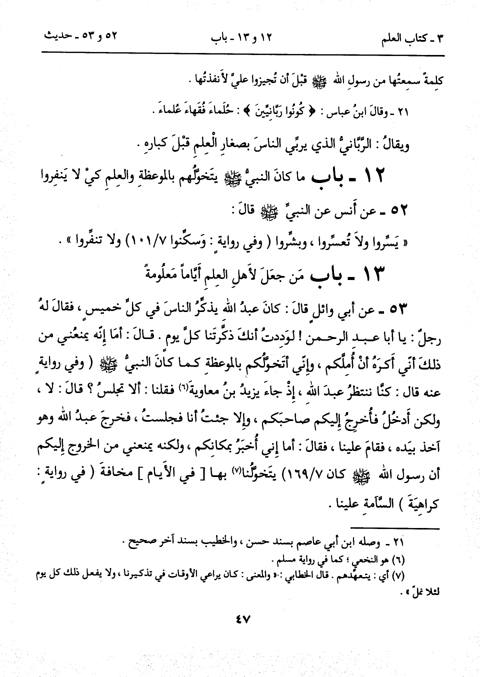 53 - عن أبي وائلٍ قالَ: كانَ عبدُ الله يذكِّرُ الناسَ في كلِّ خميسٍ، فقالَ لهُ رجلٌ: يا أبا عبدِ الرحمن! لوَدِدتُ أنكَ ذكَّرتَنا كلَّ يومٍ. قالَ: أمَا إِنَّه يمنعُني من ذلكَ أنّي أَكرَهُ أنْ أُمِلَّكم، وإِنِّي أتَخوَّلُكم بالموعظةِ كما كانَ النبيُّ - صلى الله عليه وسلم - (وفي روايةٍ عنه قال: كنَّا ننتظرُ عبدَ اللهِ، إِذْ جاءَ يزيدُ بنُ معاويةَ (6) فقلنا: ألا تجلسُ؟ قالَ: لا، ولكن أَدخُلُ فأُخرِجُ إِليكم صاحبَكم، وِإلا جئتُ أنا فجلستُ، فخرجَ عبدُ الله وهو آخذ بيَده، فقامَ علينا، فقالَ: أما إِني أُخبَرُ بمكانِكم، ولكنه يمنعني من الخروج إِليكم أن رسول الله - صلى الله عليه وسلم - كان 7/ 169) يتَخوَّلُنا (7) بها [في الأَيام] مخافةَ (في روايةٍ: كراهِيَةَ) السَّآمةِ علينا.
