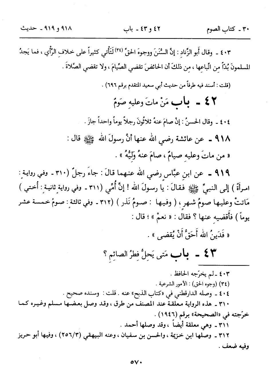 919 - عن ابنِ عبَّاسٍ رضي الله عنهما قالَ: جاءَ رجلٌ (310 - وفي روايةٍ: امرأَةٌ) إلى النبيِّ - صلى الله عليه وسلم - فقالَ: يا رسولَ الله! إنَّ أُمِّي (311 - وفي روايةٍ ثانيةٍ: أُختي) مَاتتْ وعليها صومُ شهرٍ، (وفيها: صومُ نَذر) (312 - وفي ثالثةٍ: صومُ خمسة عشر يوماً) فأَقضيهِ عنها؟ فقال: "نعمْ"؟ قال: