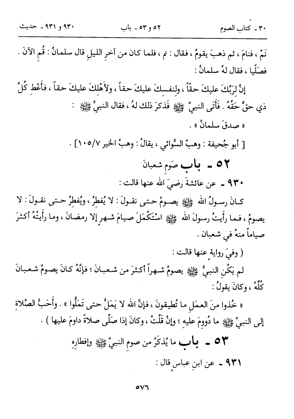 إنَّ لِرَبِّكَ عليكَ حقّاً، ولِنفسِكَ عليكَ حقاً، ولأَهْلِكَ عليكَ حقاً، فأَعْطِ كُلَّ ذي حق حَقَّهُ. فَأَتَى النبيَّ - صلى الله عليه وسلم - فَذكر ذلك له، فقال النبيُّ - صلى الله عليه وسلم -:
