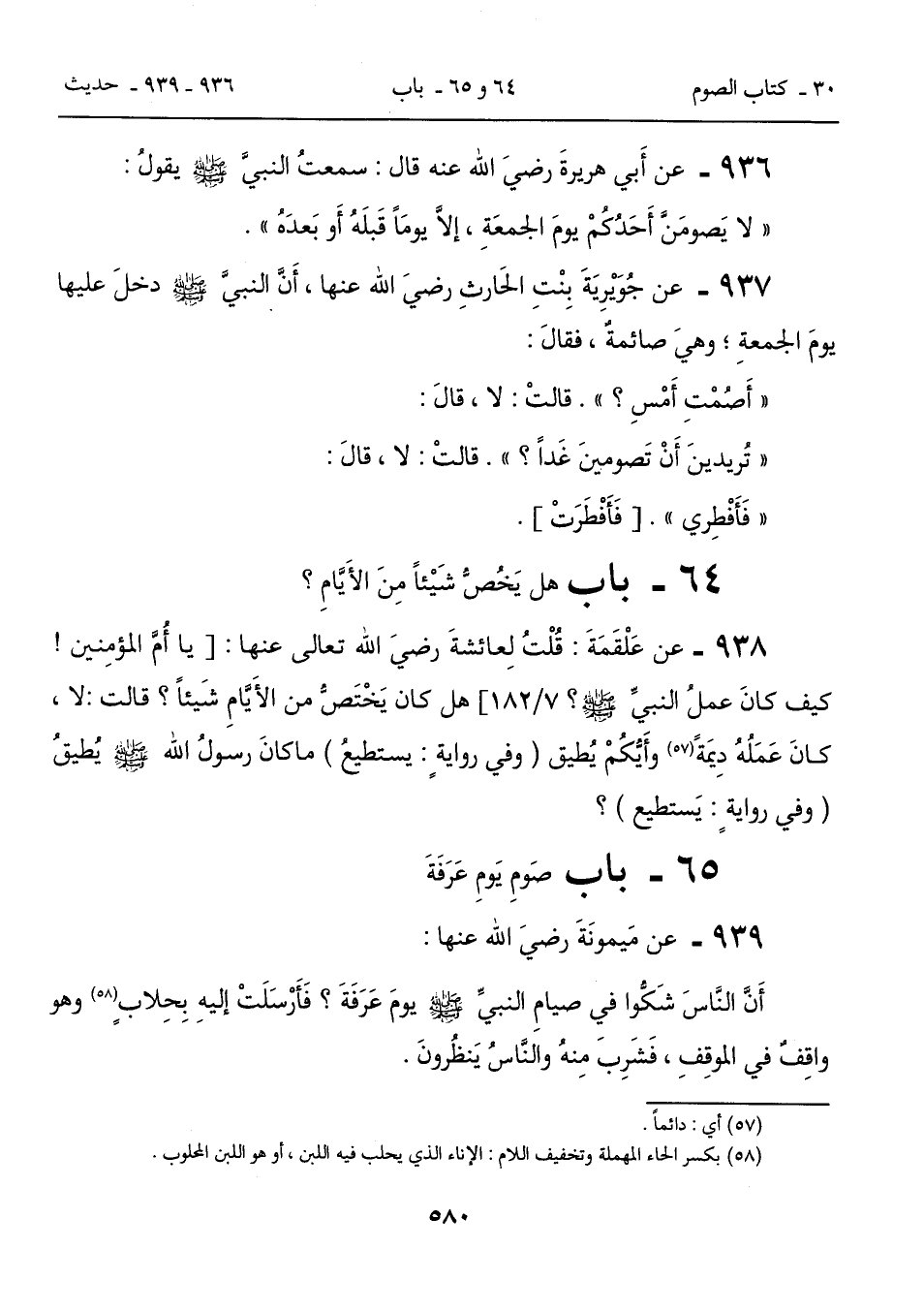 937 - عن جُوَيْرِيَةَ بِنْتِ الحَارثِ رضيَ الله عنها، أَنَّ النبيَّ - صلى الله عليه وسلم - دخلَ عليها يومَ الجمعةِ؛ وهيَ صائمةٌ، فقالَ: