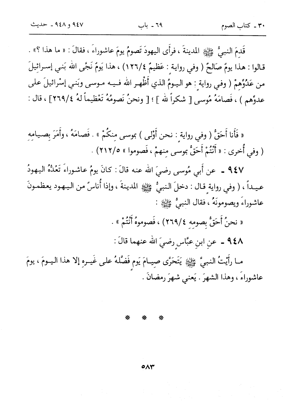 947 - عن أَبي مُوسى رضيَ الله عنه قالَ: كانَ يومُ عاشوراءَ تَعُدُّهُ اليهودُ عيداً، (وفي روايةٍ قال: دخلَ النبيُّ - صلى الله عليه وسلم - المدينةَ، وإذا أُناسٌ من اليهود يعظمونَ عاشوراءَ ويصومونَهُ، فقال النبيُّ - صلى الله عليه وسلم -: