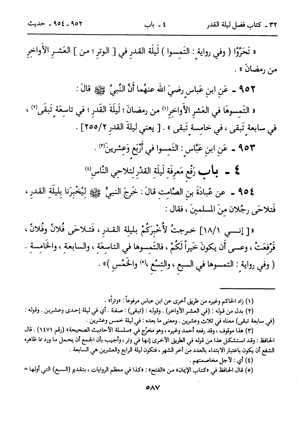 "التَمِسوهَا في العَشرِ الأَواخِرِ (1) من رمضانَ، لَيلَةَ القَدرِ؛ في تاسِعَةٍ تَبقَى (2)، في سابعةٍ تَبقى، في خامِسةٍ تَبقى". [يعني ليلةَ القدرِ 2/ 255].
