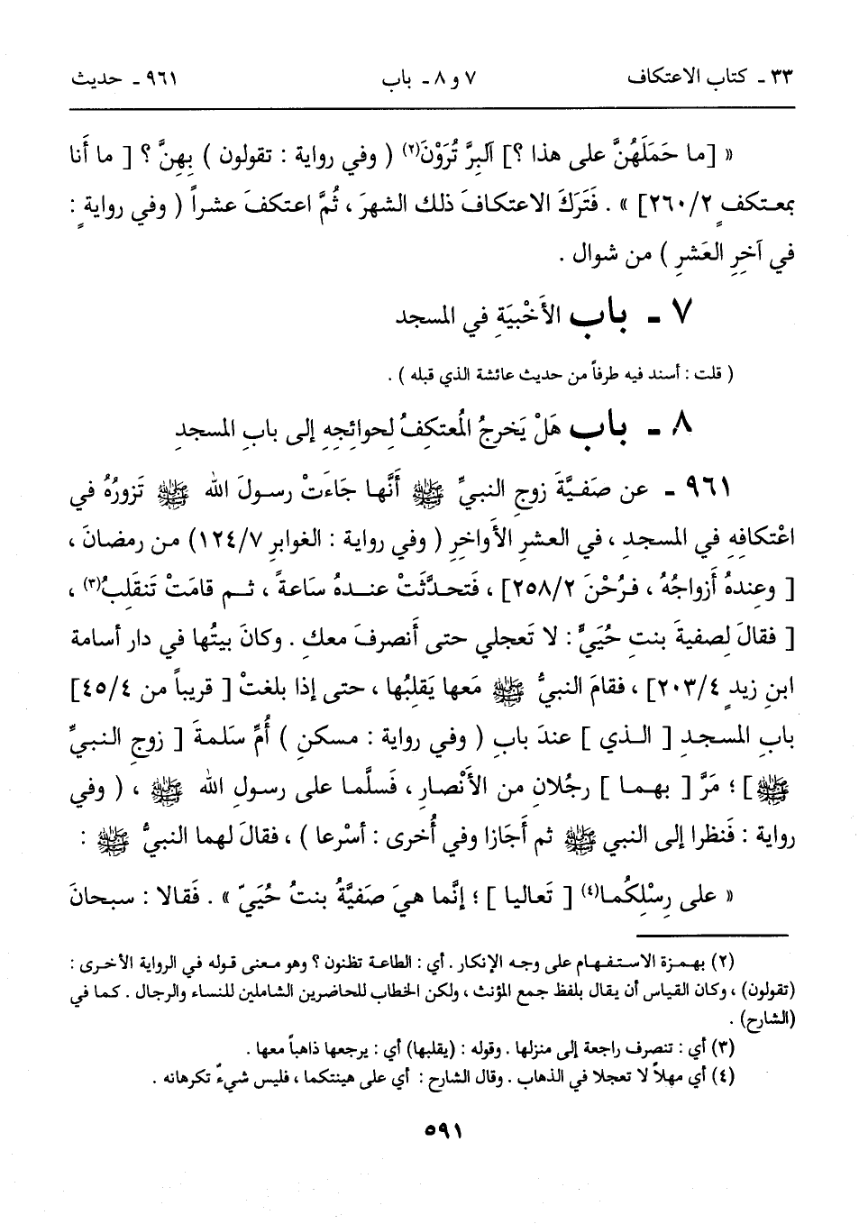 961 - عن صَفيَّةَ زوجِ النبيِّ - صلى الله عليه وسلم - أنَّها جَاءَتْ رسولَ الله - صلى الله عليه وسلم - تَزورُهُ في اعْتكافِهِ في المسجدِ، في العشرِ الأَواخِرِ (وفي روايةٍ: الغوابرِ 7/ 124) من رمضانَ، [وعِندهُ أَزواجُهُ، فرُحْنَ 2/ 258]، فَتحدَّثَتْ عندهُ سَاعةً، ثم قامَتْ تَنقَلِبُ (3)، [فقالَ لِصفيةَ بنتِ حُيَيٍّ: لا تَعجلي حتى أَنصرفَ معكِ. وكانَ بيتُها في دار أسامة ابنِ زيدٍ 4/ 203]، فقامَ النبيُّ - صلى الله عليه وسلم - مَعها يَقلِبُها، حتى إذا بلغتْ [قريباً من 4/ 45] بابِ المسجدِ [الذي] عندَ بابِ (وفي روايةٍ: مسكنِ) أُمِّ سَلمةَ [زوجِ النبيِّ - صلى الله عليه وسلم -]؛ مَرَّ [بهما] رجُلانِ من الأَنْصارِ، فَسلَّما على رسولِ الله - صلى الله عليه وسلم -، (وفي روايةٍ: فَنظرا إلى النبي - صلى الله عليه وسلم - ثم أَجَازا وفي أُخرى: أسْرعا)، فقالَ لهما النبيُّ - صلى الله عليه وسلم -: