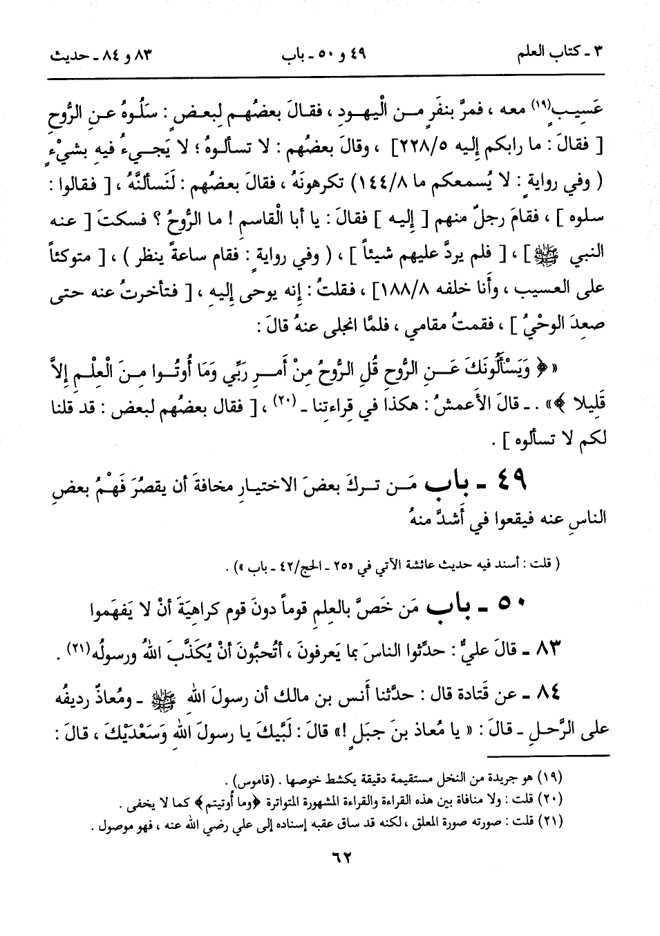 {وَيَسْأَلُونَكَ عَنِ الرُّوحِ قُلِ الرُّوحُ مِنْ أَمْرِ رَبِّي وَمَا أُوتِيتُمْ مِنَ الْعِلْمِ إِلَّا قَلِيلًا}. - قالَ الأَعمشُ: هكذا في قِراءتنا- (20)، [فقال بعضُهم لبعض: قد قلنا لكم لا تسألوه].