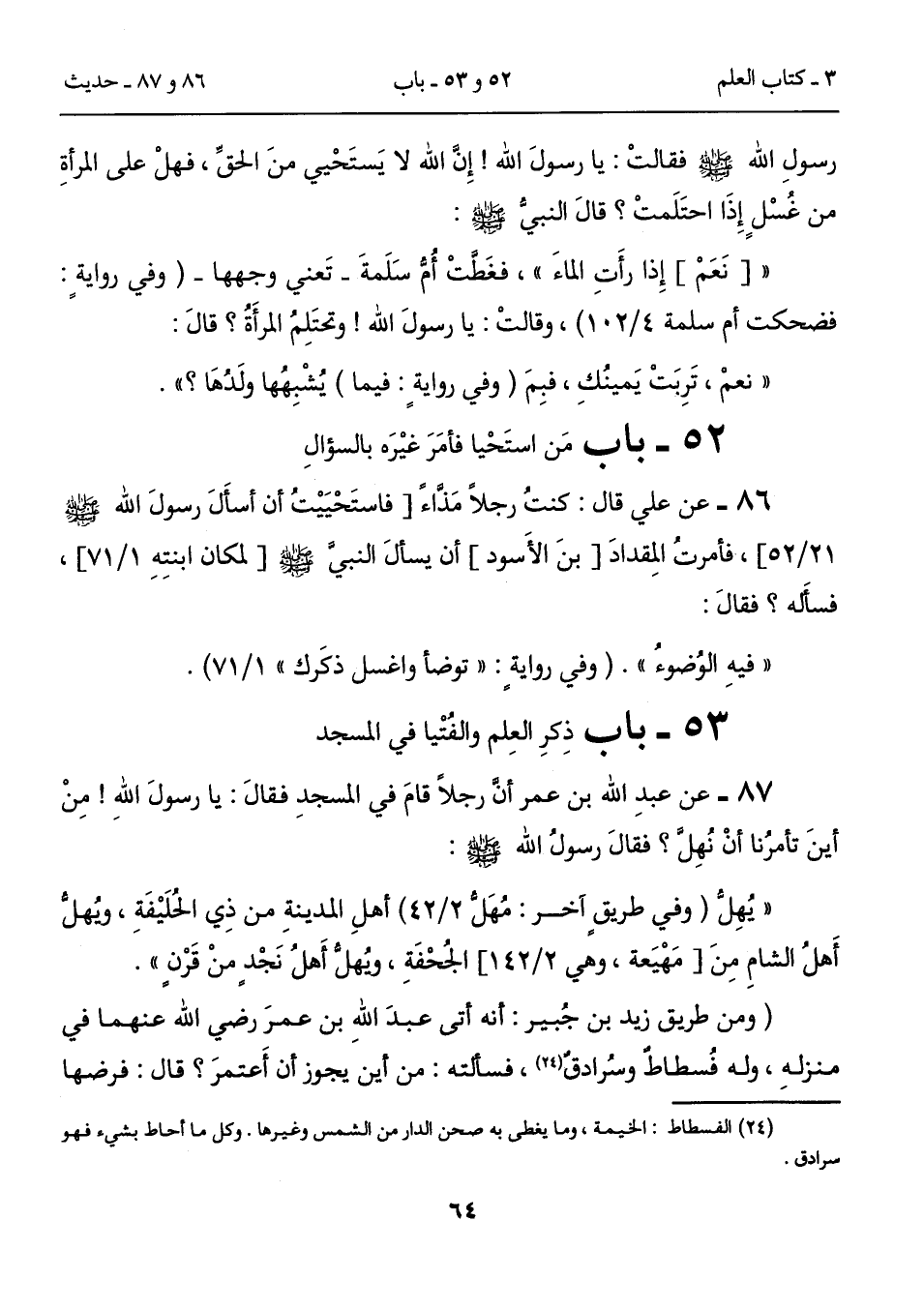 86 - عن علي قال: كنتُ رجلاً مَذَّاءً [فاستَحْيَيْتُ أن أسأَلَ رسولَ الله - صلى الله عليه وسلم - 21/ 52]، فأمرتُ المِقدادَ [بنَ الأَسود] أن يسألَ النبيَّ - صلى الله عليه وسلم -[لمكان ابنتِهِ 1/ 71]، فسأله؟ فقالَ: