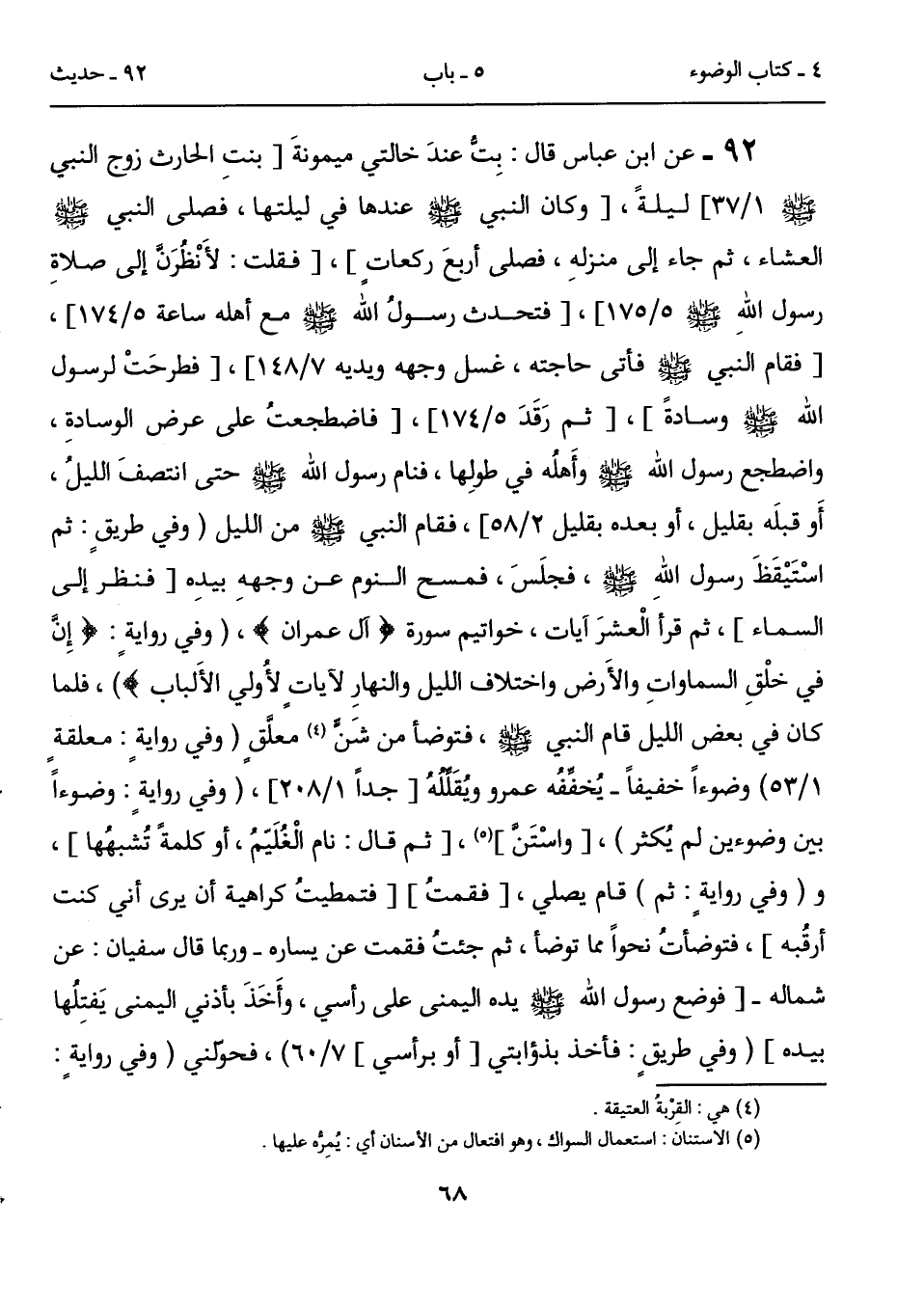 92 - عن ابن عباس قال: بِتُّ عندَ خالتي ميمونةَ [بنتِ الحارث زوج النبي - صلى الله عليه وسلم - 37/ 1] ليلةً، [وكان النبي - صلى الله عليه وسلم - عندها في ليلتها، فصلى النبي - صلى الله عليه وسلم - العشاء، ثم جاء إلى منزلهِ، فصلى أربعَ ركعاتٍ]، [فقلت: لأَنْظُرَنَّ إلى صلاةِ رسول اللهِ- صلى الله عليه وسلم -5/ 175]، [فتحدث رسولُ الله - صلى الله عليه وسلم - مع أهله ساعة 5/ 174]، [فقام النبي - صلى الله عليه وسلم - فأتى حاجته، غسل وجهه ويديه 7/ 148]، [فطرحَتْ لرسول الله - صلى الله عليه وسلم - وسادةً]، [ثم رَقَدَ 5/ 174]، [فاضطجعتُ على عرض الوسادةِ، واضطجع رسول الله - صلى الله عليه وسلم - وأَهلُه في طولِها، فنام رسول الله - صلى الله عليه وسلم - حتى انتصفَ الليلُ، أَو قبلَه بقليل، أو بعده بقليل 2/ 58]، فقام النبي - صلى الله عليه وسلم - من الليل (وفي طريقٍ: ثم اسْتَيْقَظَ رسول الله - صلى الله عليه وسلم -، فجلَسَ، فمسح النوم عن وجههِ بيدِه [فنظر إلى السماء]، ثم قرأَ الْعشرَ آيات، خواتيم سورة {آل عمران}، (وفي روايةٍ: {إِنَّ فِي خَلْقِ السَّمَاوَاتِ وَالْأَرْضِ وَاخْتِلَافِ اللَّيْلِ وَالنَّهَارِ لَآيَاتٍ لِأُولِي الْأَلْبَابِ})، فلما كان في بعض الليل قام النبي - صلى الله عليه وسلم -، فتوضأ من شَنٍّ (4) معلَّقٍ (وفي روايةٍ: معلقةٍ 1/ 53) وضوءاً خفيفاً- يُخفِّفُه عمرو ويُقَلِّلُهُ [جداً 1/ 208]، (وفي روايةٍ: وضوءاً بين وضوءين لم يُكثر)، [واسْتَنَّ] (5)، [ثم قال: نام الْغُلَيّمُ، أو كلمةً تُشبهُها]، و (وفي روايةٍ: ثم) قام يصلي، [فقمتُ] [فتمطيتُ كراهية أن يرى أني كنت أرقُبه]، فتوضأتُ نحواً مما توضأ، ثم جئتُ فقمت عن يساره- وربما قال سفيان: عن شماله-[فوضع رسول الله - صلى الله عليه وسلم - يده اليمنى على رأسي، وأَخَذَ بأذني اليمنى يَفتِلُها بيده] (وفي طريقٍ: فأخذ بذؤابتي [أو برأسي] 7/ 60)، فحوّلني (وفي روايةٍ: