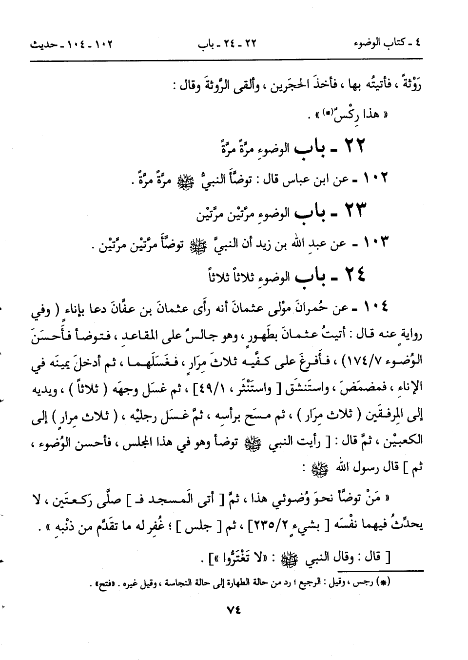 104 - عن حُمرانَ موْلى عثمانَ أنه رأَى عثمانَ بن عفَّانَ دعا بإناء (وفي روايةٍ عنه قال: أتيتُ عثمانَ بطَهورٍ، وهو جالسٌ على المقاعدِ، فتوضأ فأَحسَنَ الوُضوء 7/ 174)، فأَفرغَ على كفَّيه ثلاثَ مِرَارٍ، فغَسَلَهما، ثم أدخل يمينَه في الإناءِ، فمضمَضَ، واستَنشَق [واستَنْثَر، 1/ 49]، ثم غسَل وجهَه (ثلاثاً)، ويديه إلى المِرفقَين (ثلاث مِرَار)، ثم مسَح برأسِه، ثمَّ غسَل رجليْه، (ثلاث مِرارٍ) إلى الكعبيْن، ثمَّ قال: [رأيت النبي - صلى الله عليه وسلم - توضأ وهو في هذا المجلس، فأحسن الوُضوء، ثم] قال رسول الله - صلى الله عليه وسلم -: