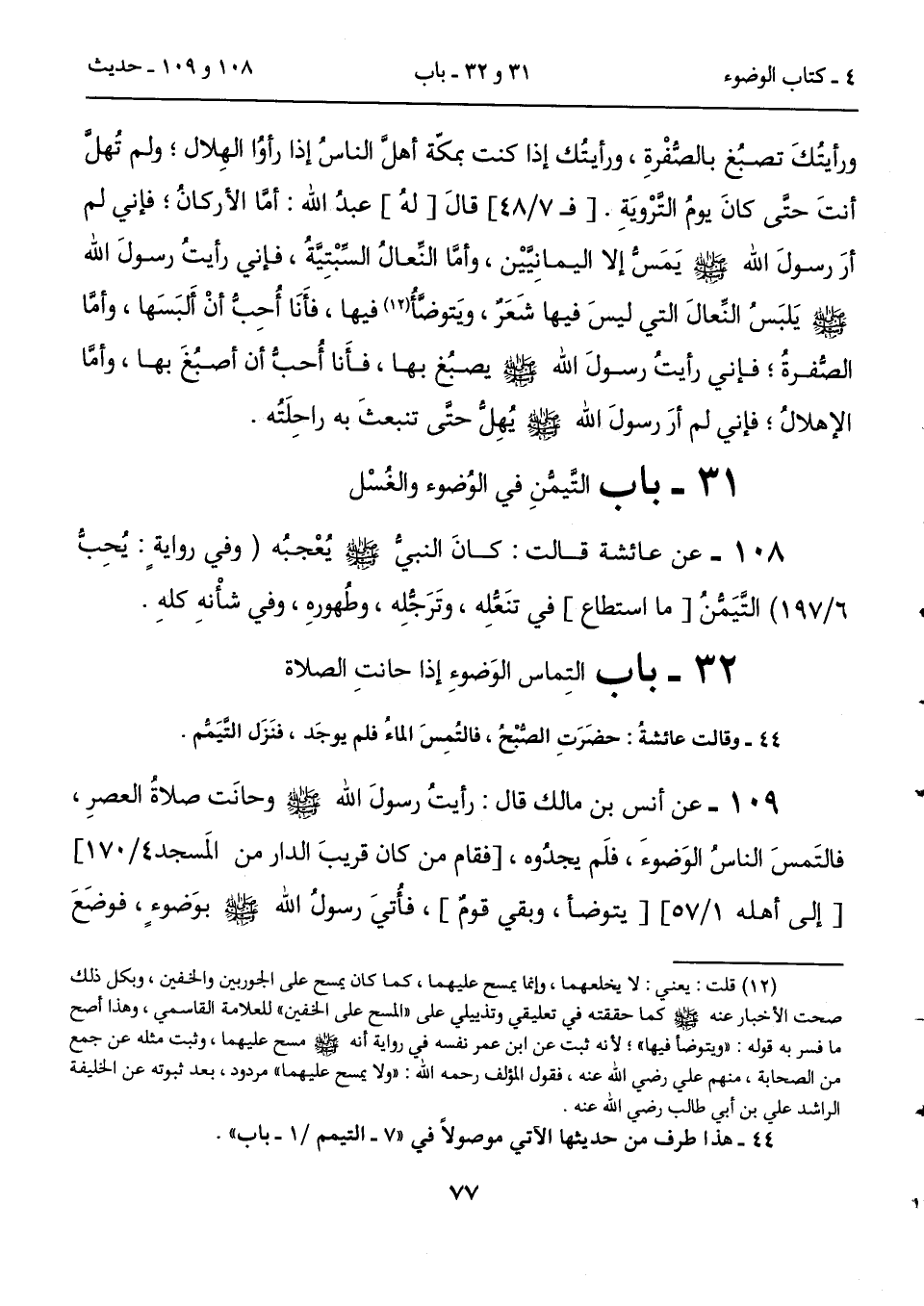 108 - عن عائشة قالت: كانَ النبيُّ - صلى الله عليه وسلم - يُعْجبُه (وفي روايةٍ: يُحِبُّ 6/ 197) التَّيَمُّنُ [ما استطاع] في تنَعُّلِه، وتَرَجُّلِه، وطُهورهِ، وفي شأْنهِ كلهِ.
