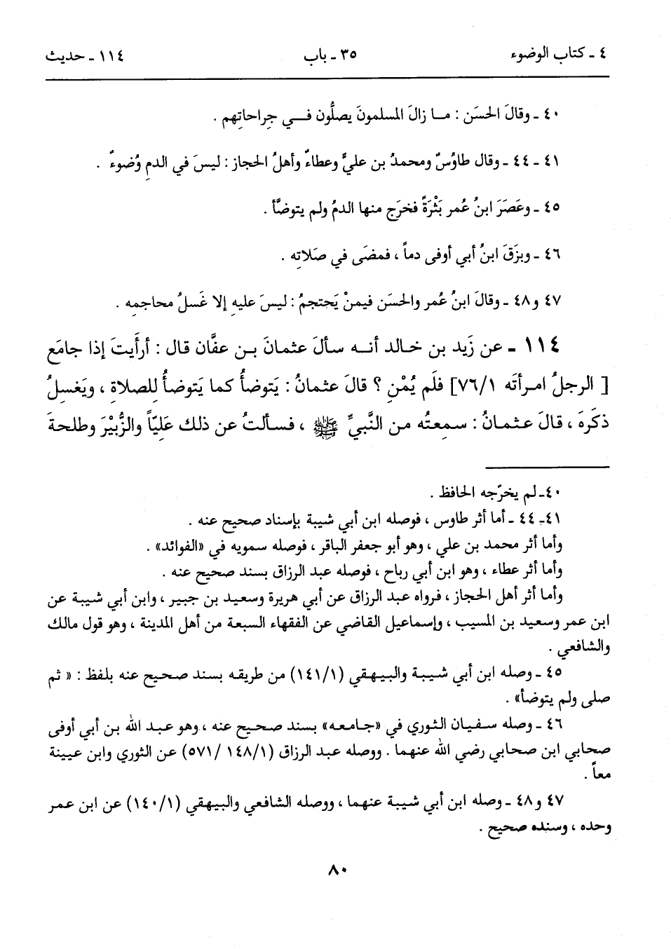114 - عن زَيد بن خالد أنه سألَ عثمانَ بن عفان قال: أرأَيتَ إذا جامَع [الرجلُ امرأتَه 1/ 76] فلَم يُمْنِ؟ قالَ عثمانُ: يَتوضأُ كما يَتوضأُ لِلصلاةِ، ويَغسِلُ ذكَرهَ، قالَ عثمانُ: سمِعتُه من النَّبيِّ- صلى الله عليه وسلم -، فسألتُ عن ذلك عَلِيّاً والزُّبيْرَ وطلحةَ