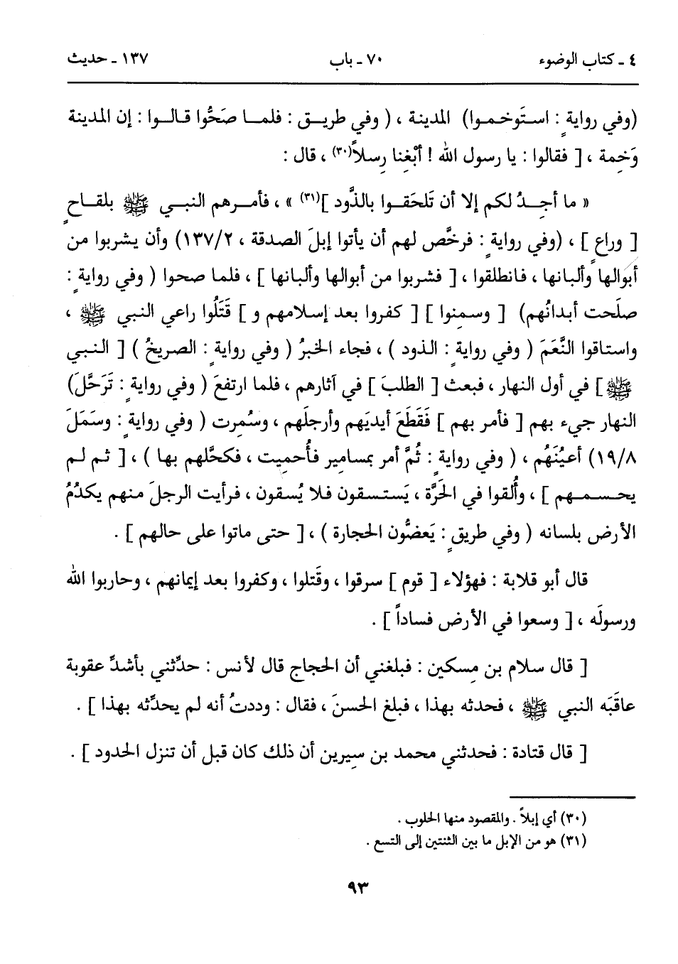 " ما أجِدُ لكم إلا أن تَلحَقوا بالذَّود] (31) "، فأمرهم النبي - صلى الله عليه وسلم - بلقاحٍ [وراعٍ]، (وفي روايةٍ: فرخَّص لهم أن يأتوا إبلَ الصدقة، 2/ 137) وأن يشربوا من أبوالها وألبانها، فانطلقوا، [فشربوا من أبوالها وألبانها]، فلما صحوا (وفي روايةٍ: صلَحت أبدانُهم) [وسمِنوا] [كفروا بعد إسلامهم و] قَتَلُوا راعي النبي - صلى الله عليه وسلم -، واستاقوا النَّعَمَ (وفي روايةٍ: الذود)، فجاء الخبرُ (وفي روايةٍ: الصريخُ) [النبي - صلى الله عليه وسلم -] في أول النهار، فبعثَ [الطلبَ] في آثارهم، فلما ارتفعَ (وفي روايةٍ: تَرَحَّلَ) النهار جيء بهم [فأمر بهم] فَقَطَعَ أيديَهم وأرجلَهم، وسُمِرت (وفي روايةٍ: وسَمَلَ 8/ 19) أعيُنَهُم، (وفي روايةٍ: ثُمَّ أمر بمسامِير فأُحمِيت، فكحَّلهم بها)، [ثم لم يحسمهم]، وألُقوا في الحَرَّة، يَستسقون فلا يُسقون، فرأيت الرجلَ منهم يكدُمُ الأرض بلسانه (وفي طريقٍ: يَعضُّون الحجارة)، [حتى ماتوا على حالهم]. قال أبو قلابة: فهؤلاء [قوم] سرقوا، وقَتلوا، وكفروا بعد إيمانهم، وحاربوا الله ورسولَه، [وسعوا في الأرض فساداً].
