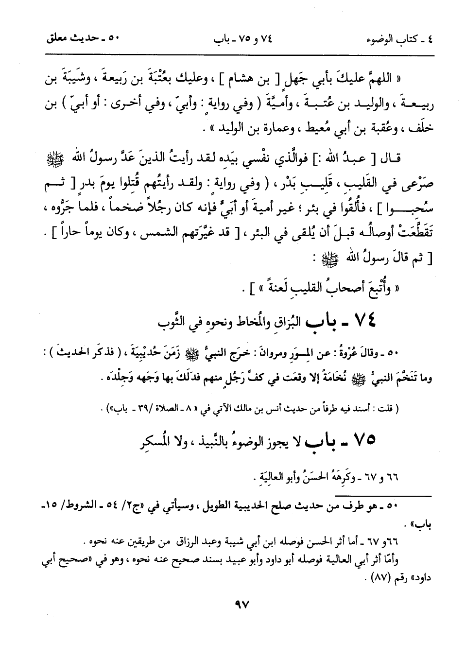 75 - باب لا يجوز الوضوءُ بالنَّبيذ، ولا المُسكِر