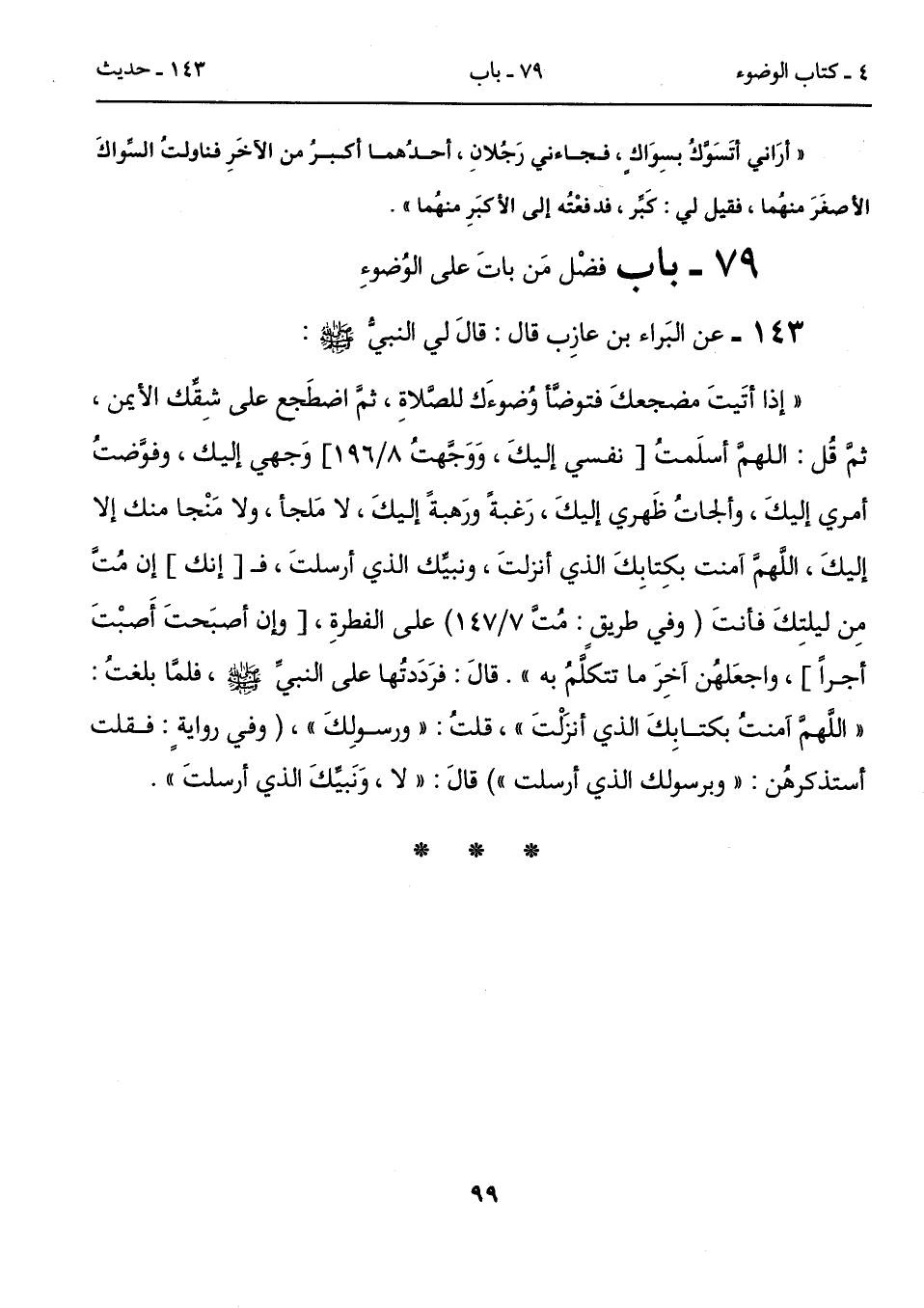 143 - عن البَراء بن عازِب قال: قالَ لي النبيُّ - صلى الله عليه وسلم -: "إذا أتَيتَ مضجعكَ فتوضَّأ وُضوءَك للصَّلاةِ، ثمَ اضطَجع على شِقِّك الأيمن، ثم قُل: اللهمَّ أسلَمتُ [نفسي إليكَ، وَوَجَّهتُ 8/ 196] وَجهي إليك، وفوَّضتُ أمري إليكَ، وَأَلْجَأْتُ ظَهري إليكَ، رَغبةً ورَهبةً إليكَ، لا مَلجأ، ولا مَنْجا منك إلا إليكَ، اللَّهُمَّ آمَنْتُ بكِتابِكَ الذي أنزلتَ، ونبيِّك الذي أرسلتَ، فـ[إنك] إن مُتَّ مِن ليلتِكَ فأنتَ (وفي طريقٍ: مُتَّ 7/ 147) على الفطرةِ، [وإن أصبَحتَ أَصبْتَ أجراً]، واجعَلهُن آخِرَ مَا تَتَكَلَّمُ به". قالَ: فرَدَدتُها على النبيِّ - صلى الله عليه وسلم -، فلمَّا بلغتُ: