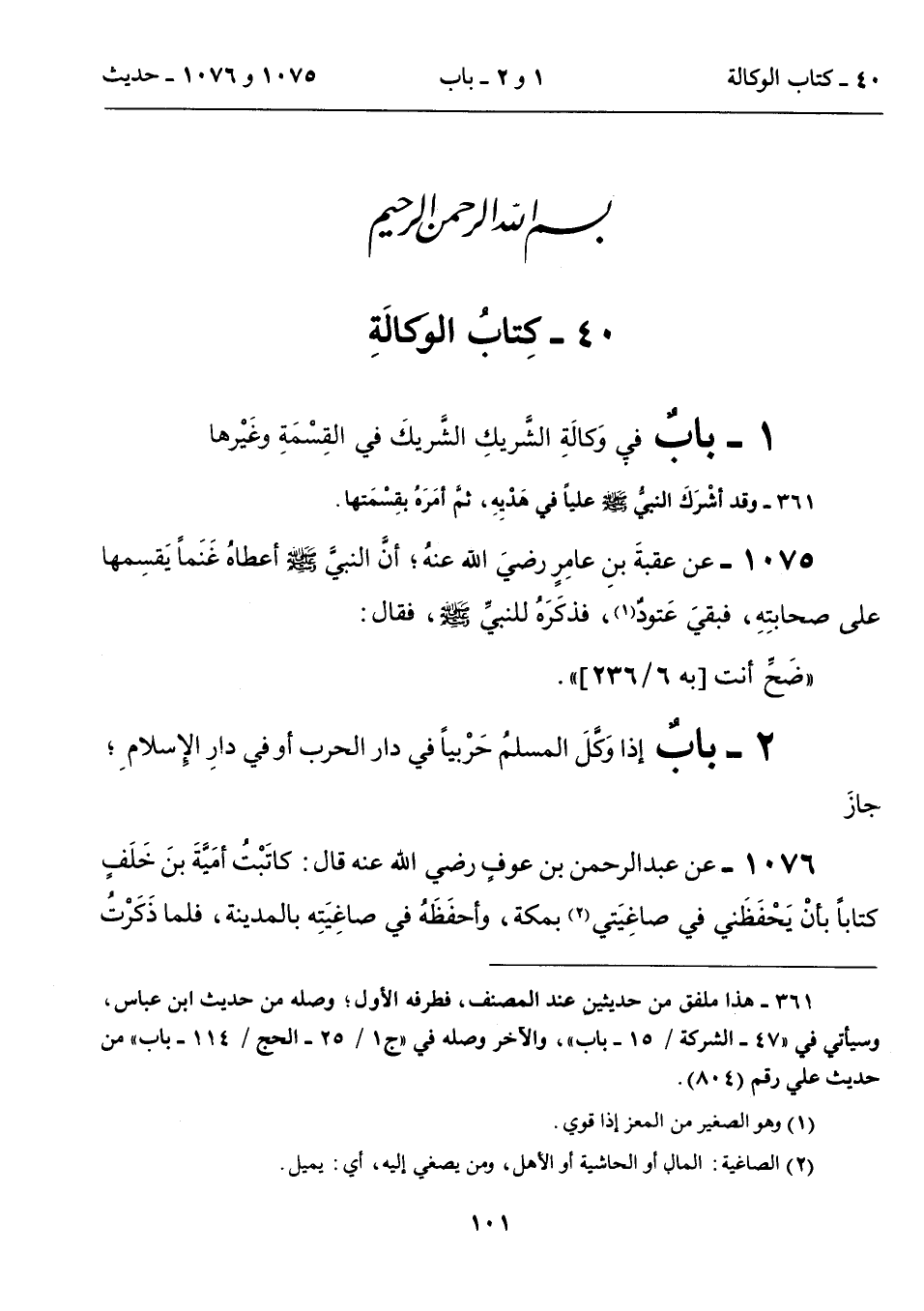 1076 - عن عبد الرحمن بن عوفٍ رضي الله عنه قال: كاتَبْتُ أمَيَّةَ بنَ خَلَفٍ كتاباً بأنْ يَحْفَظَني في صاغِيَتي (2) بمكة، وأحفَظَهُ في صاغِيَتِه بالمدينة، فلما ذَكَرْتُ