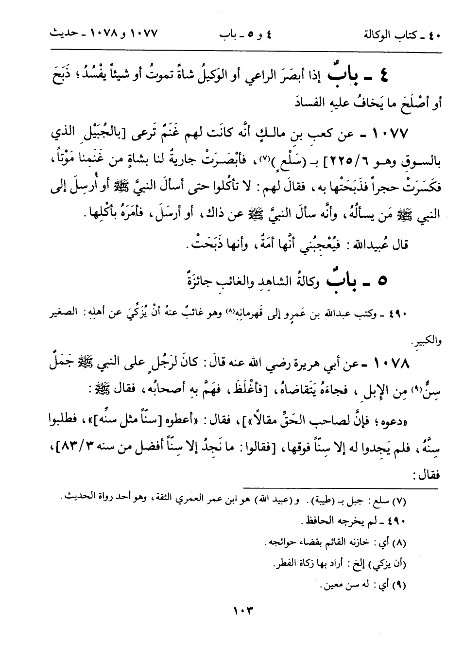 1077 - عن كعبِ بنِ مالكٍ أنَّه كانَت لهم غَنَمٌ تَرعى [بالجُبَيْلِ الذي بالسوقِ وهو 6/ 225] بـ (سَلْعٍ) (7)، فأبْصَرَتْ جاريةٌ لنا بشاةٍ من غَنَمِنا مَوْتاً، فكَسَرَتْ حجراً فذَبَحَتْها به، فقالَ لهم: لا تأكُلوا حتى أسألَ النبيَّ - صلى الله عليه وسلم - أو أُرسِلَ إلى النبي - صلى الله عليه وسلم - من يسألُهُ، وأنَّه سألَ النبيَّ - صلى الله عليه وسلم - عن ذاك، أو أرسَلَ، فأمَرَهُ بأكْلِها.