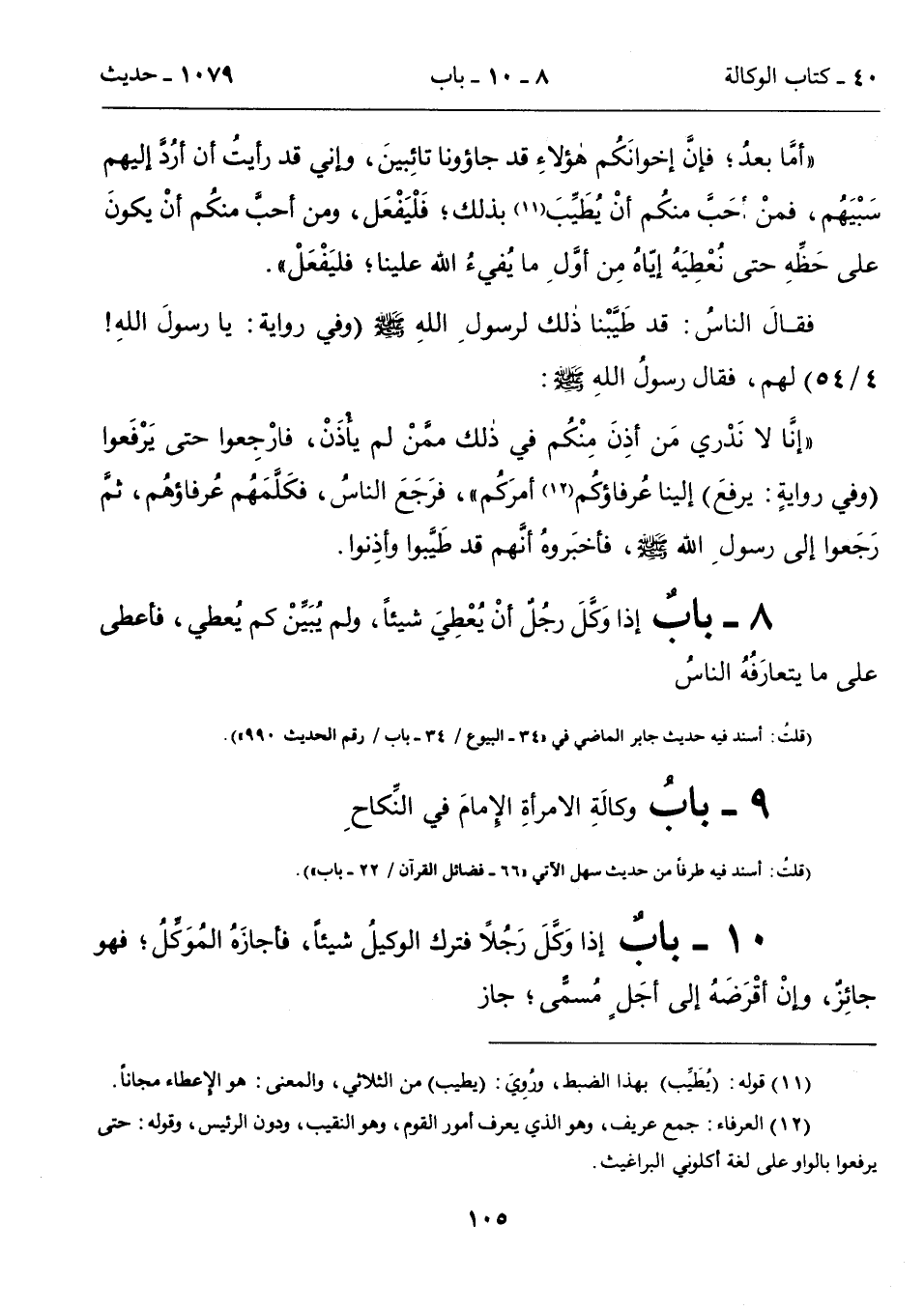 8 - بابٌ إذا وَكَّلَ رجُلٌ أنْ يُعْطِيَ شيئاً، ولم يُبَيِّنْ كم يُعطي، فأعطى على ما يتعارَفُهُ الناسُ
