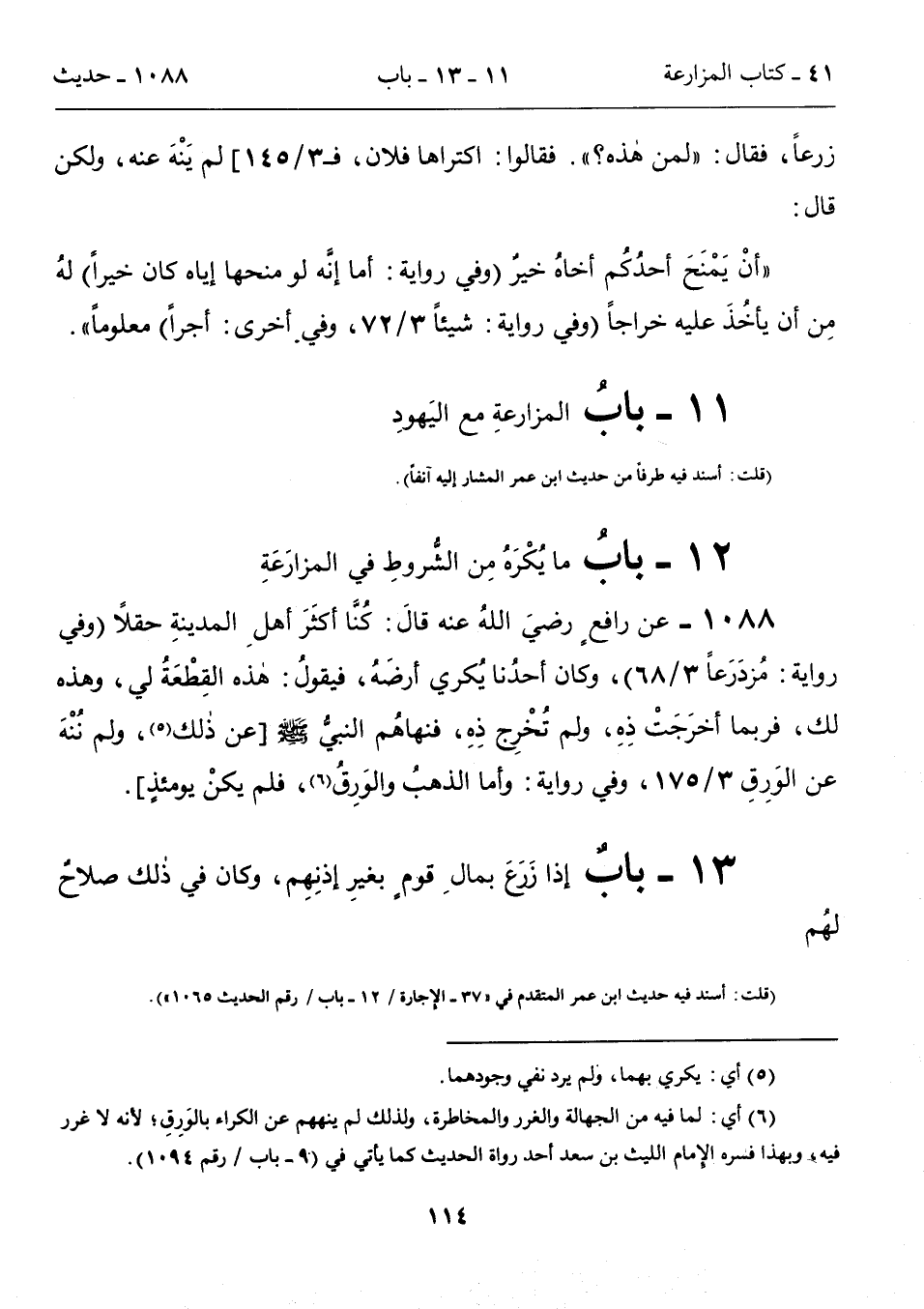 1088 - عن رافعٍ رضيَ اللهُ عنه قالَ: كُنَّا أكثَرَ أهلِ المدينةِ حقلاً (وفي روايةٍ: مُزدَرَعاً 3/ 68)، وكان أحدُنا يُكري أرضَهُ، فيقولُ: هذه القِطْعَةُ لي، وهذه لك، فربما أخرَجَتْ ذِهِ، ولم تُخْرِج ذِهِ، فنهاهُم النبيُّ - صلى الله عليه وسلم -[عن ذلك (5)، ولم نُنْهَ عن الوَرِقِ 3/ 175، وفي روايةٍ: وأما الذهبُ والوَرِقُ (6)، فلم يكنْ يومئذٍ].