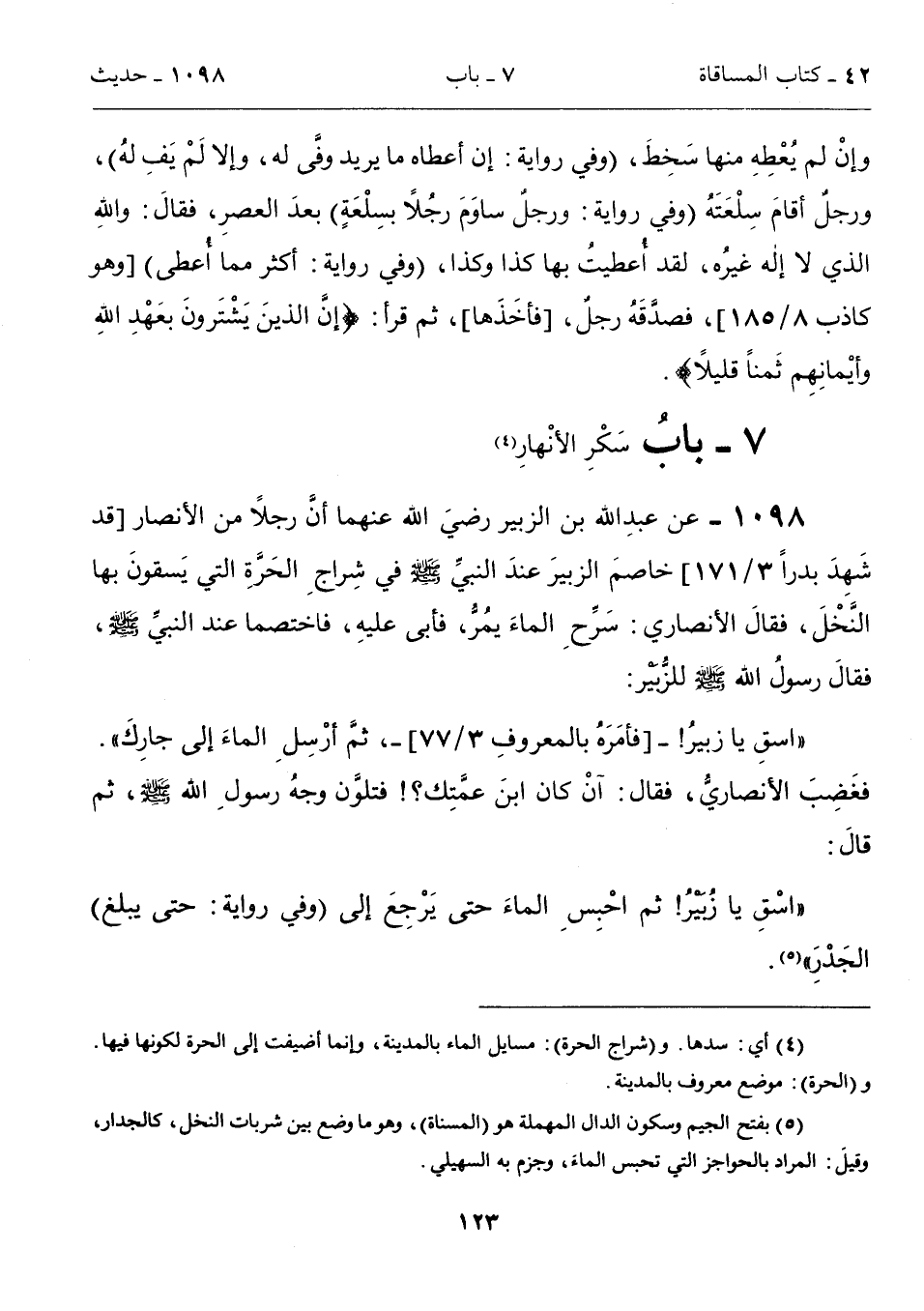 1098 - عن عبدِ الله بن الزبير رضيَ الله عنهما أنَّ رجلاً من الأنصار [قد شَهِدَ بدراً 3/ 171] خاصمَ الزبيرَ عندَ النبيِّ - صلى الله عليه وسلم - في شِراجِ الحَرَّةِ التي يَسقونَ بها النَّخْلَ، فقالَ الأنصاري: سَرِّحِ الماءَ يمُرُّ، فأبى عليهِ، فاختصما عند النبيِّ - صلى الله عليه وسلم -، فقالَ رسولُ الله - صلى الله عليه وسلم - للزُّبير: