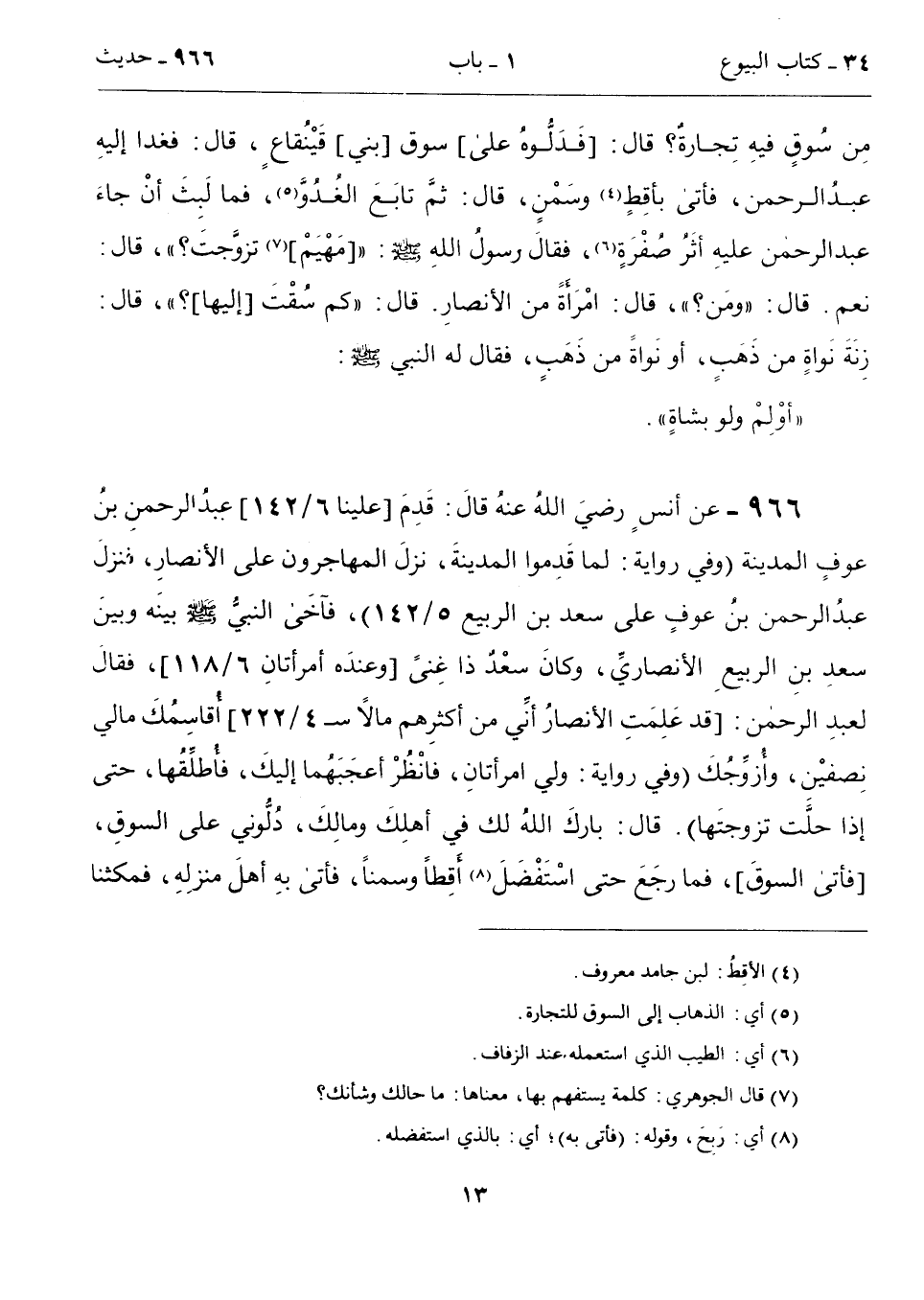 مِن سُوقٍ فيهِ تِجارةٌ؟ قال: [فَدَلُّوهُ على] سوق [بني] قَيْنُقاعٍ، قال: فغدا إليهِ عبدُ الرحمن، فأتى بأقِطٍ (4) وسَمْنٍ، قال: ثمَّ تابَعَ الغُدُوَّ (5)، فما لَبِثَ أنْ جاءَ عبد الرحمن عليهِ أثَرُ صُفْرَةٍ (6)، فقالَ رسولُ اللهِ - صلى الله عليه وسلم -: " [مَهْيَمْ] (7) تزوَّجتَ؟ "، قال: نعم. قال: "ومَن؟ "، قال: امْرَأَةً من الأنصارِ. قال: "كم سُقْتَ [إليها]؟ "، قال: زِنَةَ نَواةٍ من ذَهَبٍ، أو نَواةً من ذَهَبٍ، فقال له النبي - صلى الله عليه وسلم -: