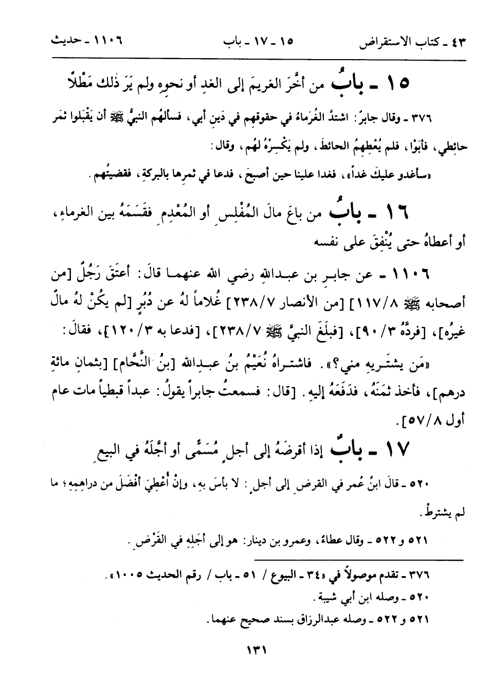 1106 - عن جابرِ بن عبد اللهِ رضي الله عنهما قالَ: أعتَقَ رَجُلٌ [من أصحابه - صلى الله عليه وسلم - 7/ 118] [من الأنصار 7/ 238] غُلاماً لهُ عن دُبُرٍ [لم يكنْ لهُ مال غيرُه]، [فردَّهُ 3/ 90]، [فبلَغَ النبيَّ - صلى الله عليه وسلم -7/ 238]، [فدعا به 3/ 120]، فقالَ: