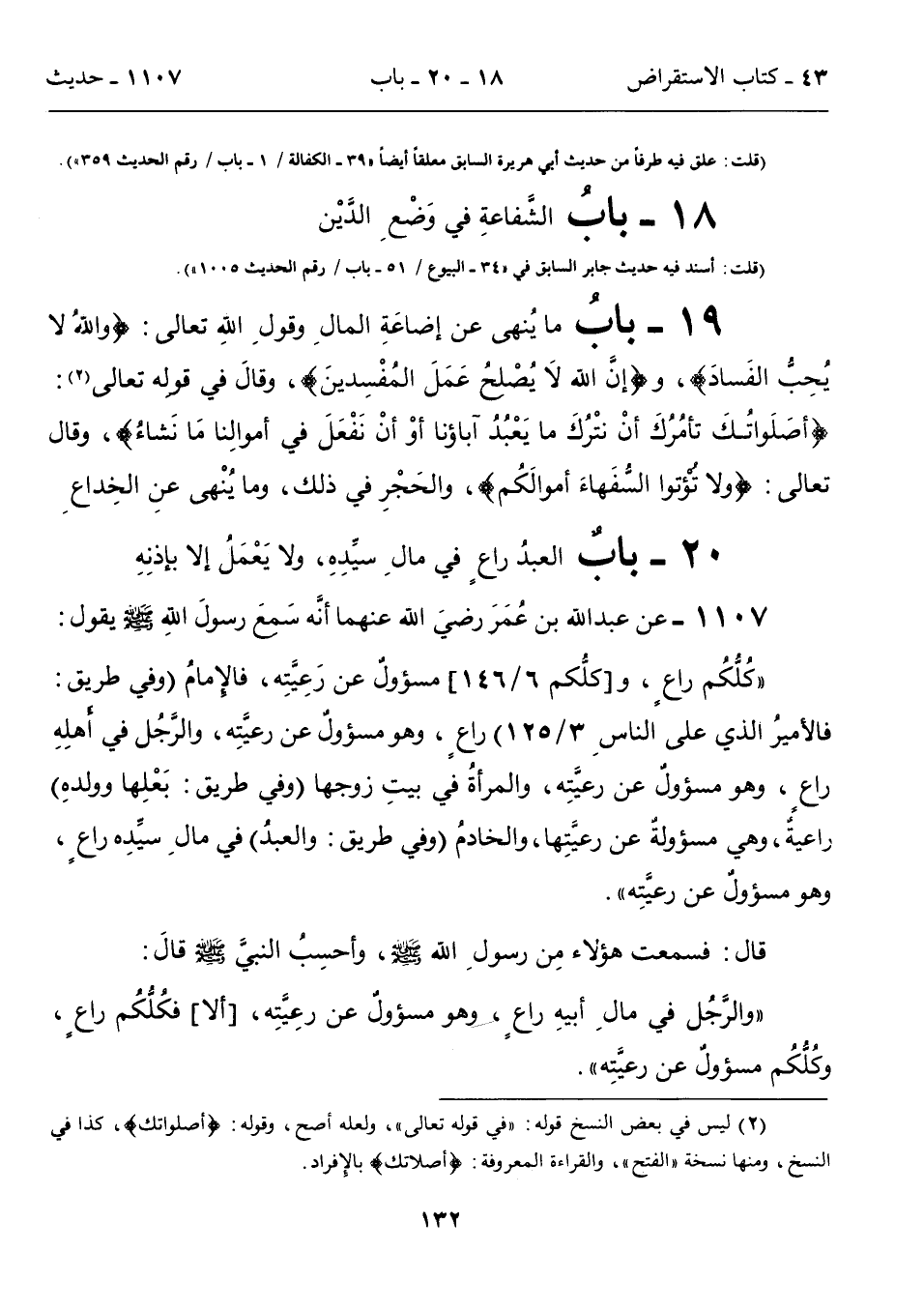1107 - عن عبد الله بن عُمَرَ رضيَ الله عنهما أنَّه سَمِعَ رسولَ اللهِ - صلى الله عليه وسلم - يقول: "كُلُّّكُم راعٍ، و [كلُّكم 6/ 146] مسؤولٌ عن رَعِيَّتِه، فالإمامُ (وفي طريق: فالأميرُ الذي على الناسِ 3/ 125) راعٍ، وهو مسؤولٌ عن رعيَّتِه، والرَّجُل في أَهلِهِ راعٍ، وهو مسؤولٌ عن رعيَّتِه، والمرأةُ في بيتِ زوجها (وفي طريق: بَعْلِها وولدهِ) راعيةٌ، وهي مسؤولةٌ عن رعيَّتِها، والخادمُ (وفي طريق: والعبدُ) في مالِ سيِّدِه راعٍ، وهو مسؤولٌ عن رعيَّتِه".