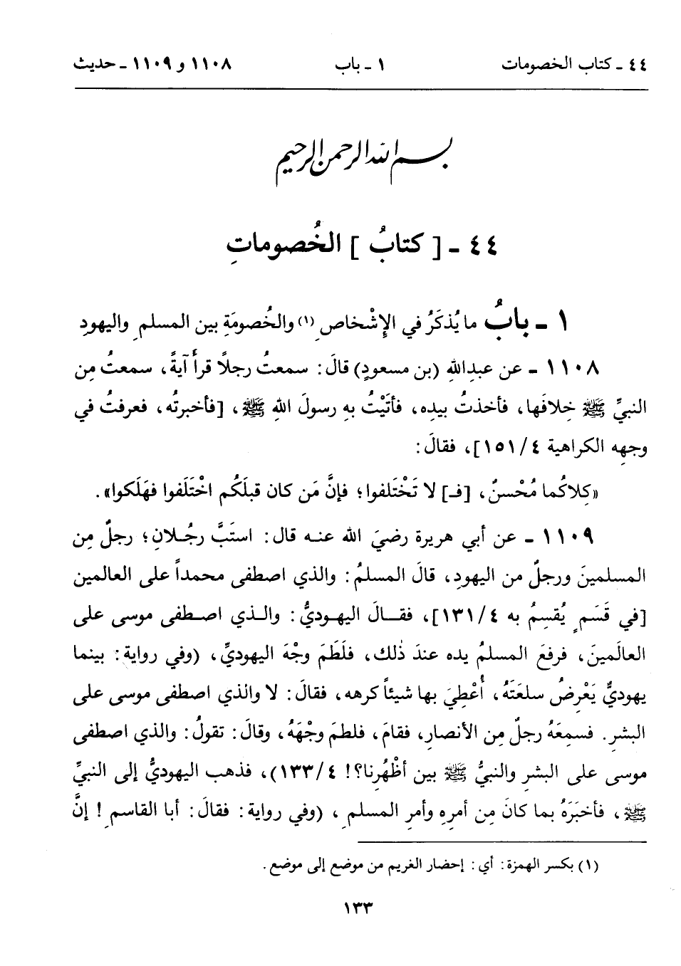 1109 - عن أبي هريرة رضيَ الله عنه قال: استَبَّ رجُلانِ؛ رجلٌ مِن المسلمينَ ورجلٌ من اليهودِ، قالَ المسلمُ: والذي اصطفى محمداً على العالمين [في قَسَمٍ يُقسِمُ به 4/ 131]، فقالَ اليهوديُّ: والذي اصطفى موسى على العالَمينَ، فرفعَ المسلمُ يده عندَ ذلك، فلَطَمَ وجْهَ اليهوديِّ، (وفي روايةٍ: بينما يهوديٌّ يَعْرِضُ سلعَتَهُ، أُعطِيَ بها شيئاً كرهه، فقالَ: لا والذي اصطفى موسى على البشرِ. فسمِعَهُ رجلٌ مِن الأنصارِ، فقامَ، فلطمَ وجْهَهُ، وقالَ: تقولُ: والذي اصطفى موسى على البشرِ والنبيُّ - صلى الله عليه وسلم - بين أظْهُرِنا؟! 4/ 133)، فذهب اليهوديُّ إلى النبيِّ - صلى الله عليه وسلم -، فأخبَرَهُ بما كانَ من أمرِهِ وأمرِ المسلمِ، (وفي روايةٍ: فقالَ: أبا القاسمِ! إنَّ