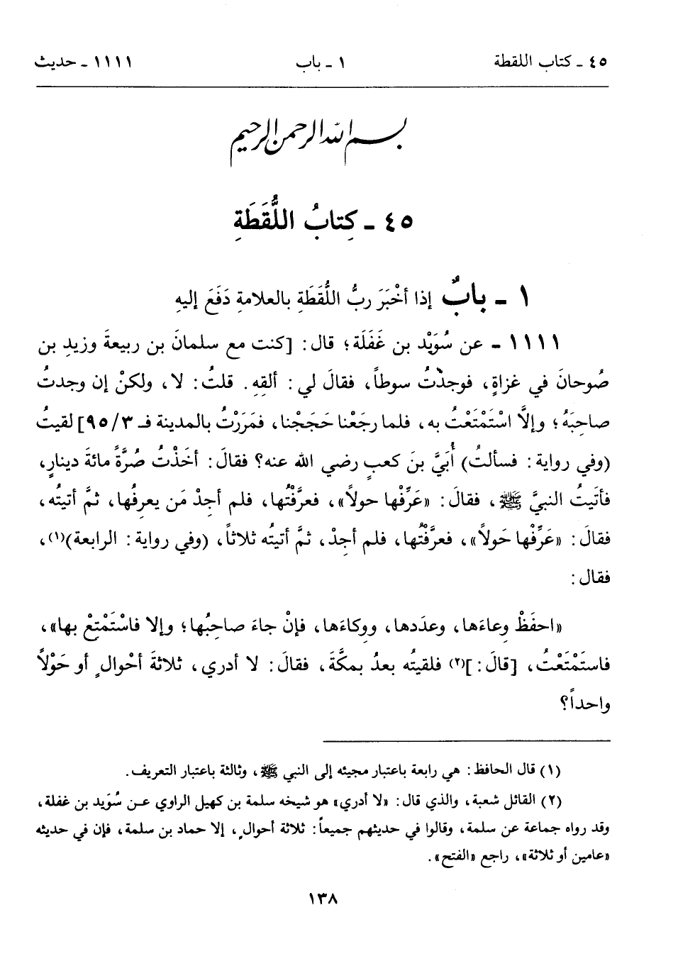 1111 - عن سُوَيْد بن غَفَلَة؛ قال: [كنت مع سلمانَ بن ربيعةَ وزيدِ بن صُوحانَ في غزاةٍ، فوجدْتُ سوطاً، فقالَ لي: ألقِهِ. قلتُ: لا، ولكنْ إن وجدتُ صاحِبَهُ؛ وإلاَّ اسْتَمتَعْتُ به، فلما رجَعْنا حَجَجْنا، فمَرَرْتُ بالمدينة فـ 3/ 95] لقيتُ (وفي روايةٍ: فسألتُ) أُبَيَّ بنَ كعبٍ رضي الله عنه؟ فقالَ: أخَذْتُ صُرَّةً مائةَ دينارٍ، فأتَيتُ النبيَّ - صلى الله عليه وسلم -، فقالَ: "عَرِّفْها حولاً"، فعرَّفْتُها، فلم أجِدْ مَن يعرِفُها، ثمَّ أتيتُه، فقالَ: "عَرِّفْها حَولاً"، فعرَّفْتُها، فلم أجِدْ، ثمَّ أتيتُه ثلاثاً، (وفي روايةٍ: الرابعة) (1)، فقال: