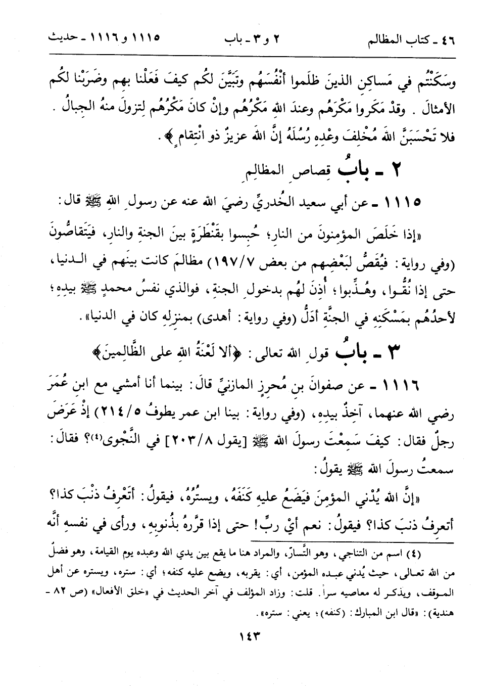 (4) اسم من التناجي، وهو التَّسارّ، والمراد هنا ما يقع بين يدي الله وعبده يوم القيامة، وهو فضلٌ من الله تعالى، حيث يُدني عبده المؤمن، أي: يقربه، ويضع عليه كنفه؛ أي: ستره، ويستره عن أهل الموقف، ويُذكرُ له معاصيه سراً. قلت: وزاد المؤلف في آخر الحديث في "خلق الأفعال" (ص 82 - هندية): "قال ابن المبارك: (كنفه)؛ يعني: ستره".