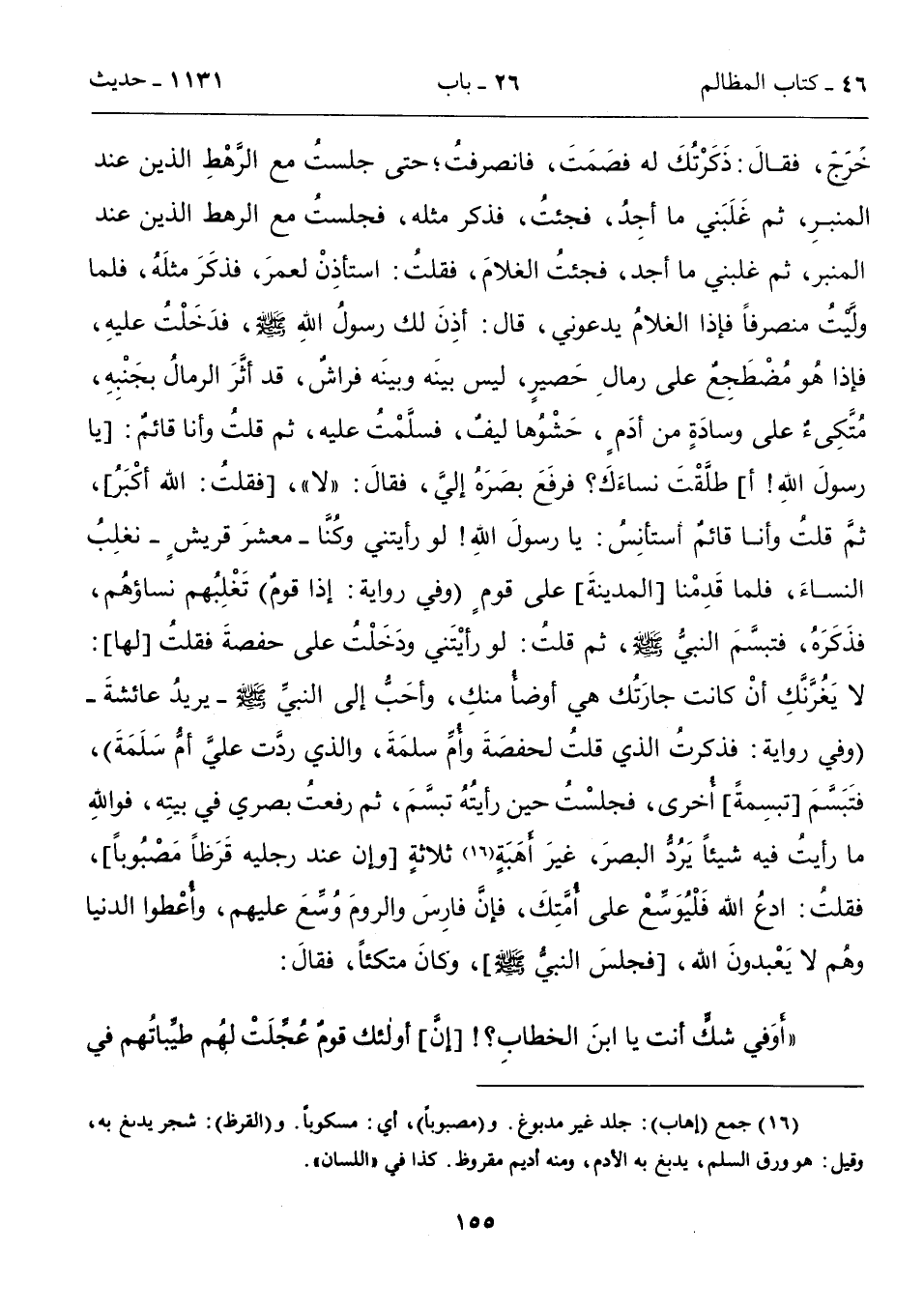 خَرَج، فقالَ: ذَكَرْتُكَ له فصَمَتَ، فانصرفتُ؛ حتى جلستُ مع الرَّهْطِ الذين عند المنبرِ، ثم غَلَبَني ما أجِدُ، فجئتُ، فذكر مثله، فجلستُ مع الرهط الذين عند المنبر، ثم غلبني ما أجد، فجئتُ الغلامَ، فقلتُ: استأذِنْ لعمرَ، فذكَرَ مثلَهُ، فلما ولَّيْتُ منصرفاً فإذا الغلامُ يدعوني، قال: أذِنَ لك رسولُ اللهِ - صلى الله عليه وسلم -، فدَخَلْتُ عليهِ، فإذا هو مُضْطَجِعٌ على رمالِ حَصيرٍ، ليس بينَه وبينَه فراشٌ، قد أثَّرَ الرمالُ بجَنْبِهِ، مُتَّكِىءٌ على وسادَةٍ من أدَمٍ، حَشْوُها ليفٌ، فسلَّمْتُ عليه، ثم قلتُ وأنا قائمٌ: [يا رسولَ اللهِ! أ] طلَّقت نساءَكَ؟ فرفَعَ بصَرَهُ إليَّ، فقالَ: "لا"، [فقلتُ: الله أكْبَرُ]، ثم قلتُ وأنا قائمٌ أستأنِسُ: يا رسولَ الله! لو رأيتني وكُنَّا- معشرَ قريشٍ- نغلِبُ النساءَ، فلما قَدِمْنا [المدينةَ] على قومٍ (وفي روايةٍ: إذا قومٌ) تَغْلِبُهم نساؤهُم، فذَكَرَهُ، فتبسَّمَ النبيُّ - صلى الله عليه وسلم -، ثم قلتُ: لو رأيْتَني ودَخَلْتُ على حفصةَ فقلتُ [لها]: لا يَغُرَّنَّكِ أنْ كانت جارَتُك هي أوضأُ منكِ، وأحَبُّ إلى النبيِّ - صلى الله عليه وسلم - يريدُ عائشةَ- (وفي روايةٍ: فذكرت الذي قلتُ لحفصَةَ وأُمِّ سلمَةَ، والذي ردَّت عليَّ أمُّ سَلَمَةَ)، فتَبَسَّمَ [تبسِمةً] أُخرى، فجلسْتُ حين رأيتُهُ تبسَّمَ، ثم رفعتُ بصري في بيتِه، فواللهِ ما رأيت فيه شيئاً يَرُدُّ البصرَ، غيرَ أَهَبَةٍ (16) ثلاثةٍ [وإن عند رجليه قَرَظاً مَصْبُوباً]، فقلت: ادعُ الله فَلْيُوَسِّعْ على أُمَّتِكَ، فإنَّ فارِسَ والرومَ وُسِّع عليهم، وأُعْطوا الدنيا وهم لا يَعْبدونَ الله، [فجلسَ النبيُّ - صلى الله عليه وسلم -]، وكانَ متكئاً، فقالَ: "أوَ في شكٍّ أنت يا ابنَ الخطابِ؟! [إنَّ] أولئك قومٌ عُجِّلَتْ لهُم طيِّباتُهم في