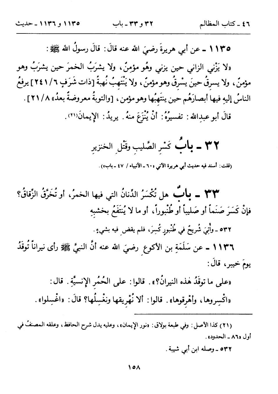 "لا يَزْني الزاني حين يزني وهُو مؤمِنٌ، ولا يشرَبُ الخمرَ حين يشرَبُ وهو مؤمنٌ، ولا يسرِقُ حينَ يسْرِقُ وهو مؤمنٌ، ولا يَنْتَهِبُ نُهبةً [ذات شَرَفٍ 6/ 241] يرفعُ الناسُ إليهِ فيها أبصارَهُم حين ينتَهِبُها وهو مؤمن، [والتوبةُ معروضةٌ بعدُ" 8/ 21].