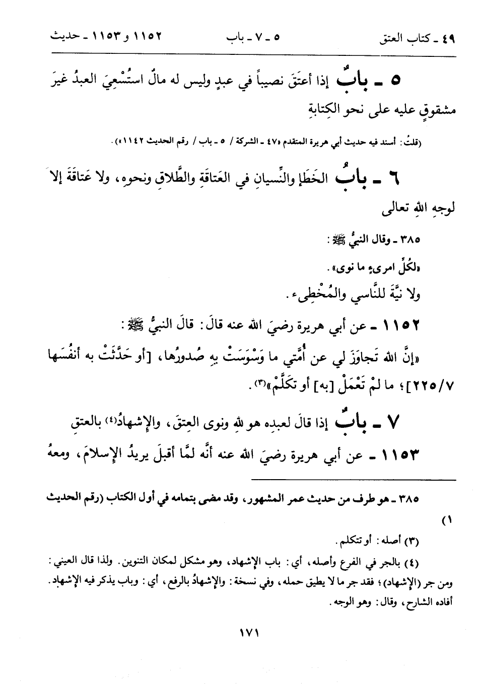 7 - بابٌ إذا قالَ لعبدِه هو للهِ ونوى العِتقَ، والإِشهادُ (4) بالعتقِ