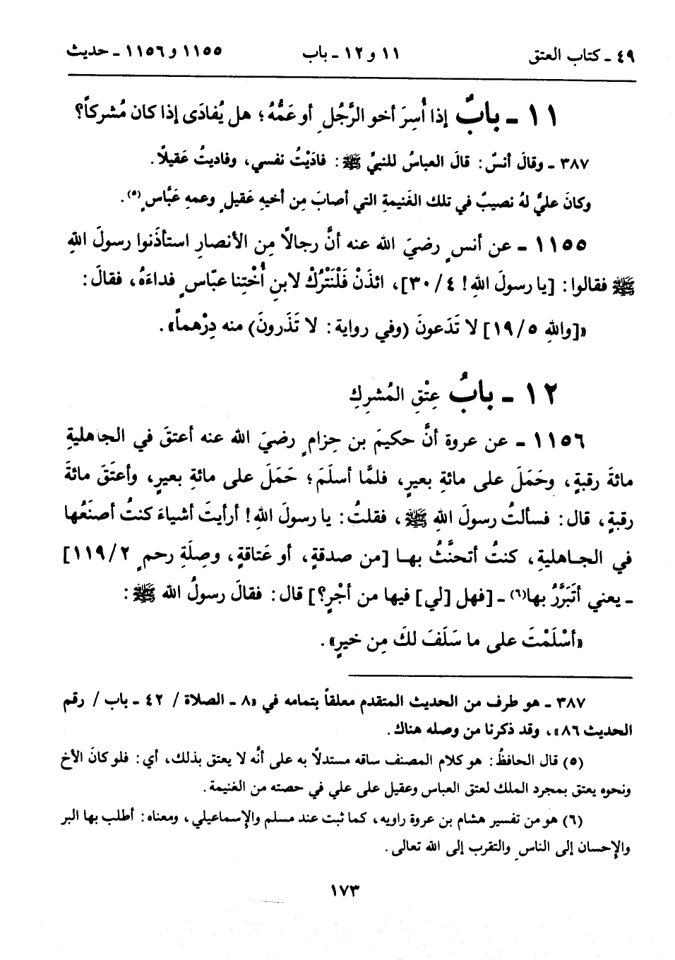1155 - عن أنسٍ رضيَ الله عنه أنَّ رجالاً مِن الأنصارِ استأذَنوا رسولَ الله - صلى الله عليه وسلم - فقالوا: [يا رسول اللهِ! 4/ 30]، ائذَنْ فلْنَتْرُكْ لابنِ أُخْتِنا عبّاسٍ فداءَهُ، فقالَ: