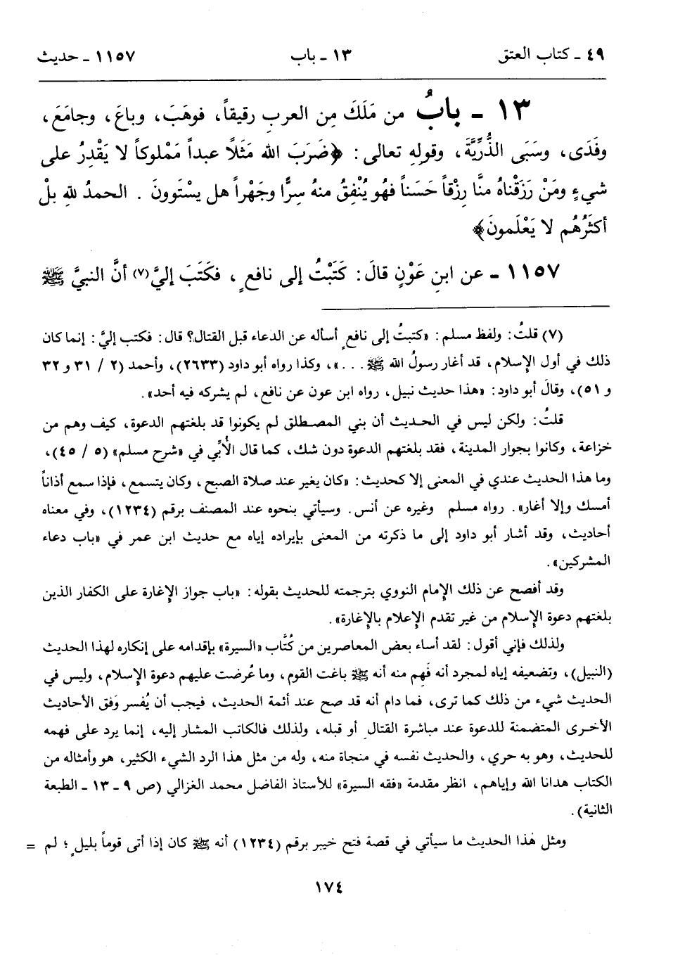 (7) قلتُ: ولفظ مسلم: "كتبتُ إلى نافعٍ أسأله عن الدعاء قبل القتال؟ قال: فكتب إليَّ: إنما كان ذلك في أول الإسلام، قد أغار رسولُ الله - صلى الله عليه وسلم - ... "، وكذا رواه أبو داود (2633)، وأحمد (2/ 31 و 32 و 51)، وقالَ أبو داود: "هذا حديث نبيل، رواه ابن عون عن نافع، لم يشركه فيه أحد".