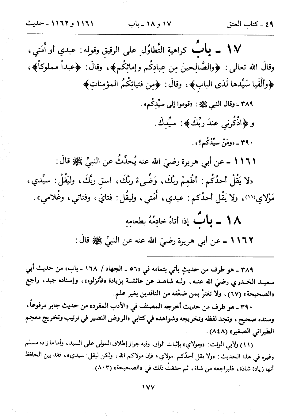 "لا يَقُلْ أحدُكُم: أطْعِمْ ربَّكَ، وَضِّىءْ ربَّكَ، اسقِ ربَّكَ، وليَقُلْ: سيِّدي، مَوْلاي (11)، ولا يَقُل أحدُكم: عبدي، أَمَتي، وليقُل: فتايَ، وفتاتي، وغُلامي".