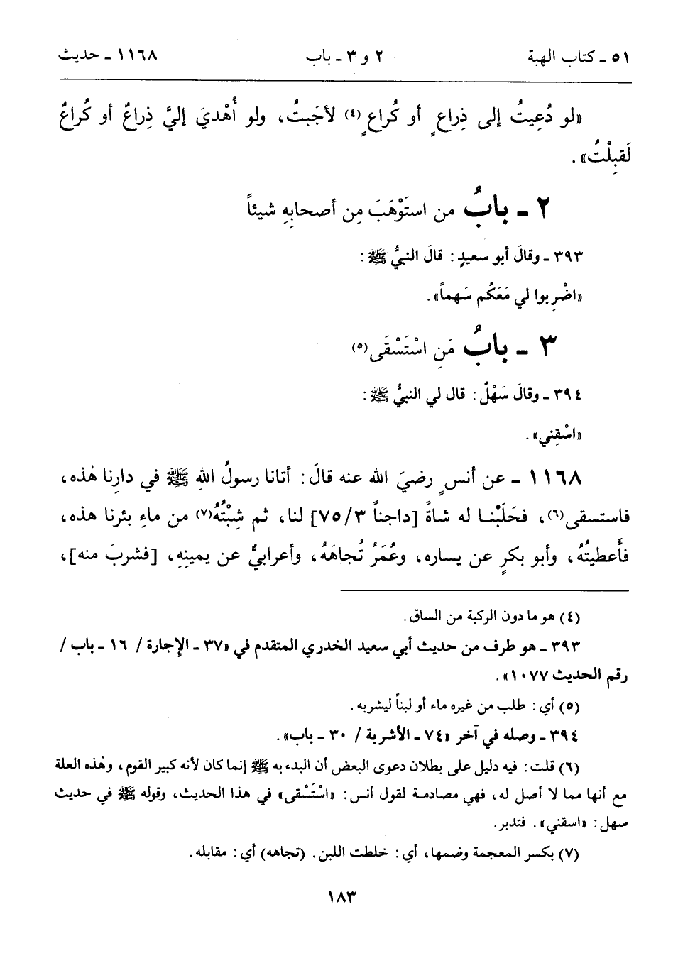 1168 - عن أنسٍ رضيَ الله عنه قالَ: أتانا رسولُ اللهِ - صلى الله عليه وسلم - في دارِنا هذه، فاستسقى (6)، فحَلَبْنا له شاةً [داجناً 3/ 75] لنا، ثم شِبْتُهُ (7) من ماءِ بئرنا هذه، فأعطيتهُ، وأبو بكرٍ عن يساره، وعُمَرُ تُجاهَهُ، وأعرابيٌّ عن يمينِهِ، [فشربَ منه]،