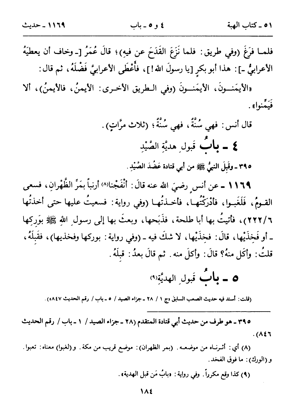 1169 - عن أنسٍ رضيَ الله عنه قالَ: أنْفَجْنا (8) أرنباً بمَرِّ الظَّهْرانِ، فسعى القومُ، فَلَغَبوا، فأدْرَكْتُها، فأخذتُها (وفي رواية: فسعيتُ عليها حتى أخذتُها 6/ 222)، فأتيتُ بها أبا طلحة، فذَبَحها، وبعثَ بها إلى رسولِ اللهِ - صلى الله عليه وسلم - بوَرِكِها - أو فَخِذَيْها، قالَ: فخِذَيْها، لا شك فيه- (وفي روايةٍ: بوركها وفخذيها)، فقَبِلَهُ، قلتُ: وأكَل منهُ؟ قالَ: وأكلَ منه. ثم قالَ بعدُ: قبِلَهُ.