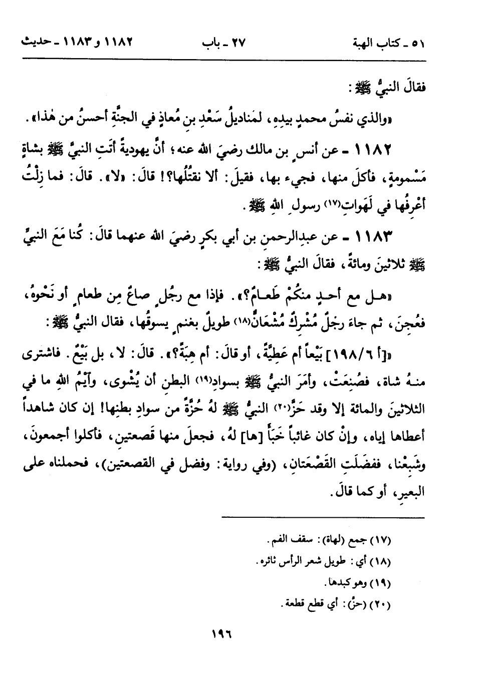 1182 - عن أنسٍ بن مالك رضيَ الله عنه؛ أنَّ يهوديةً أتَتِ النبيَّ - صلى الله عليه وسلم - بشاةٍ مَسْمومةٍ، فأكلَ منها، فجيء بها، فقيلَ: ألا نقتُلُها؟! قالَ: "لا". قالَ: فما زِلْتُ أعْرِفُها في لَهَواتِ (17) رسولِ الله - صلى الله عليه وسلم -.