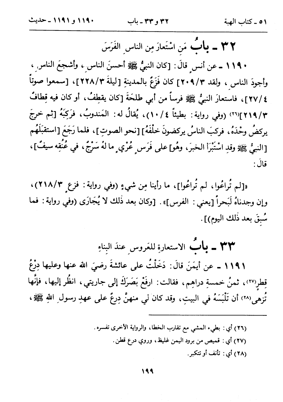1190 - عن أنس قالَ: [كان النبيُّ - صلى الله عليه وسلم - أحسنَ الناسِ، وأشجعَ الناس، وأجودَ الناسِ، ولقد 3/ 209] كان فَزغَ بالمدينةِ [ليلةَ 3/ 228]، [سمعوا صوتاً 27/ 4]، فاستعارَ النبيُ - صلى الله عليه وسلم - فرساً من أي طلحَةَ [كان يقطِفُ، أو كان فيه قِطاف 9/ 213] (26) (وفي رواية: بطيئاً 4/ 10)، يقالُ له: المَندوبُ، فرَكِبَهُ [ثم خرجَ يركضُ وحْدَهُ، فركبَ الناسُ يركضونَ خلْفَهُ] [نحو الصوتِ]، فلما رَجَعَ [استقبَلَهُم [النبيُّ - صلى الله عليه وسلم - وقدِ اسْتَبْرَأ الخبرَ، وهُو] على فَرَس عُرْي ما لهُ سَرْج، في عُنُقِه سيف]، قالَ: