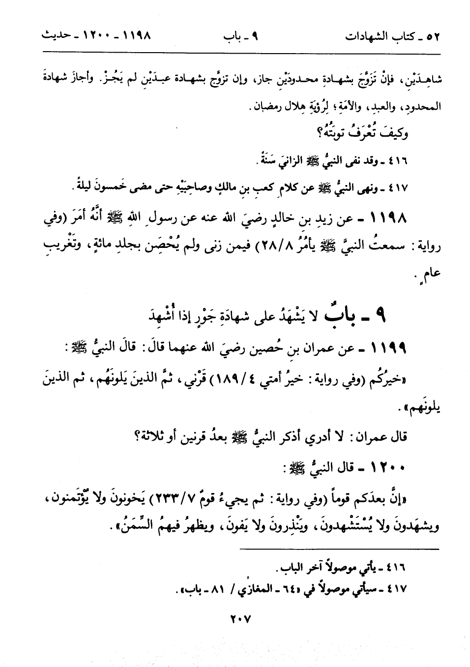 1199 - عن عمران بنِ حُصين رضيَ الله عنهما قالَ: قالَ النبي - صلى الله عليه وسلم -: " خيرُكُم (وفي روايةٍ: خيرُ أمتي 4/ 189) قَرْني، ثم الذينَ يَلونَهُم، ثم الذينَ يلونَهم".