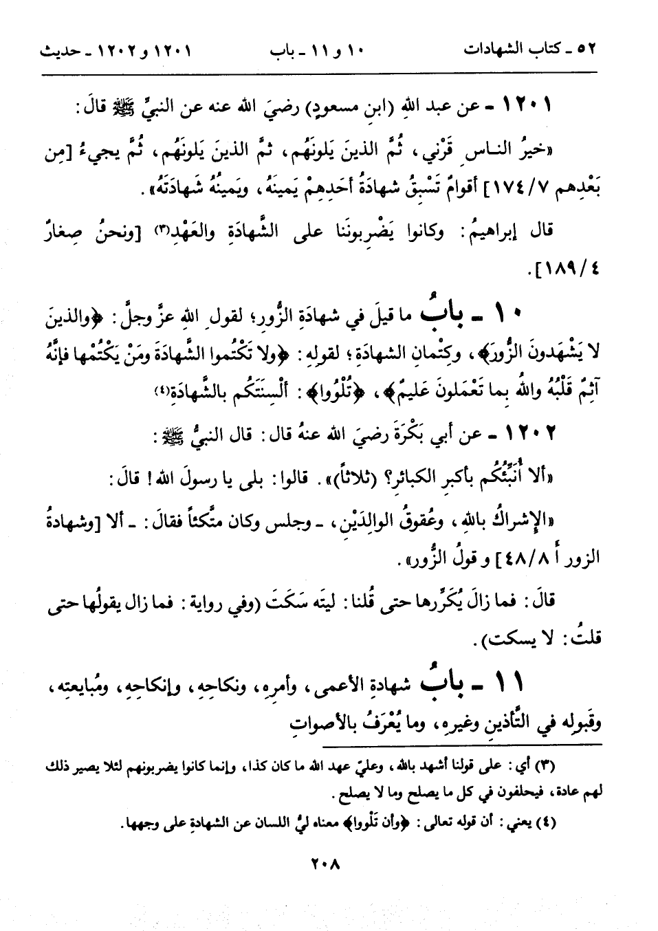 10 - بابُ ما قيلَ في شهادَةِ الزورِ؛ لقولِ اللةِ عزَّ وجلَّ: {والذينَ لا يَشْهَدونَ الزورَ}، وكِتْمانِ الشهادَةِ؛ لقولهِ: {ولا تَكْتُموا الشهادَةَ ومَنْ يكْتُمْها فإنهُ آثِم قَلْبُهُ والله بِما تَعْمَلونَ عَليم}، {تُلْوُوا}: ألْسِنَتَكُم بالشهادَةِ (4)