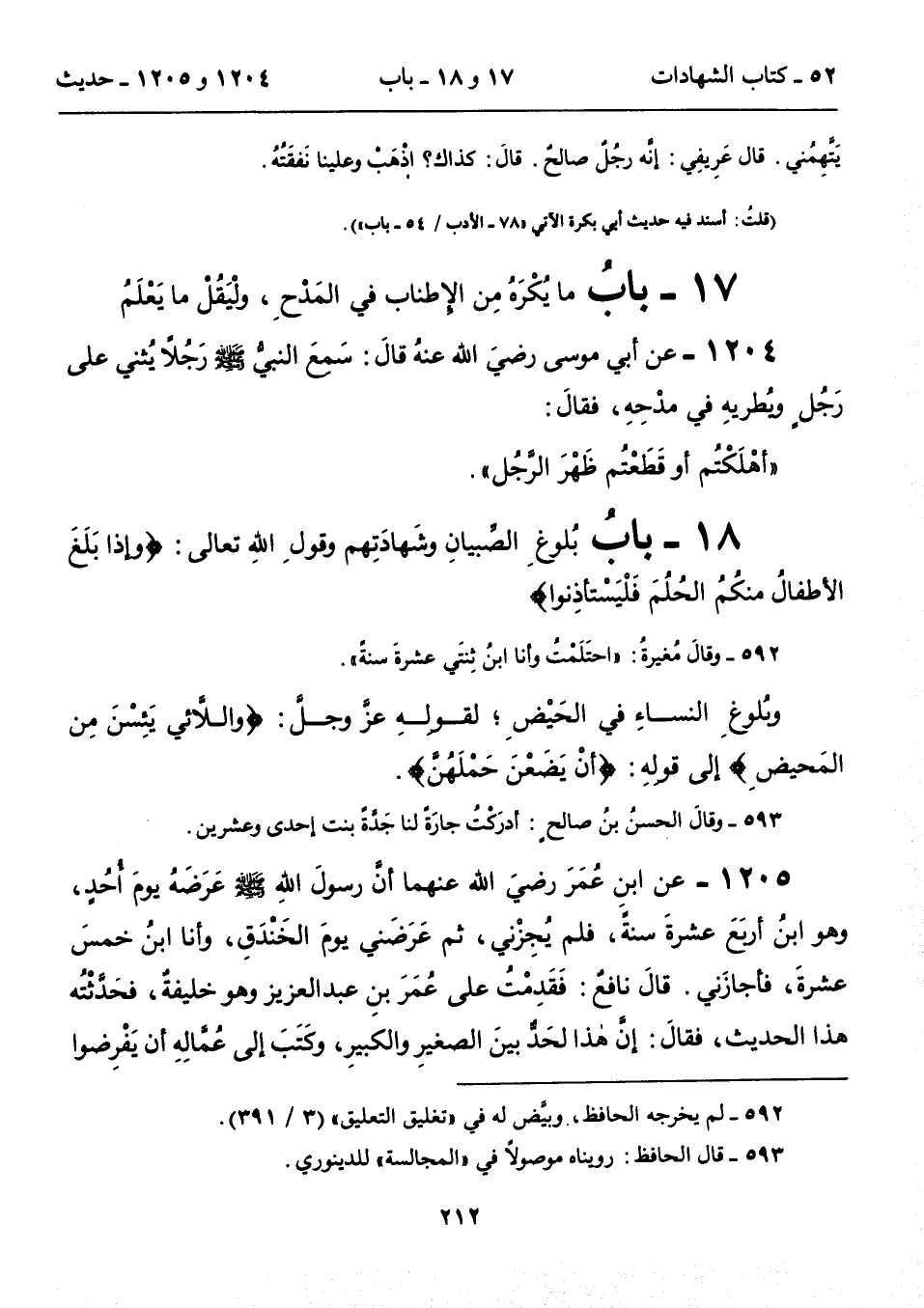 1205 - عن ابنِ عُمَرَرضيَ الله عنهما أن رسولَ الله - صلى الله عليه وسلم - عَرَضَهُ يومَ احُدٍ، وهو ابنُ أربعَ عشرةَ سنةً، فلم يُجِزْني، ثم عَرَضَني يومَ الخَنْدَقِ، وأنا ابنُ خمسَ عشرةَ، فاجازَني. قالَ نافع: فَقَدِمْتُ على عُمَرَ بنِ عبد العزيز وهو خليفة، فحدثْتُه هذا الحديث، فقالَ: إن هذا لحَد بينَ الصغيرِ والكبيرِ، وكَتَبَ إلى عُمالِهِ أن يَفْرِضوا