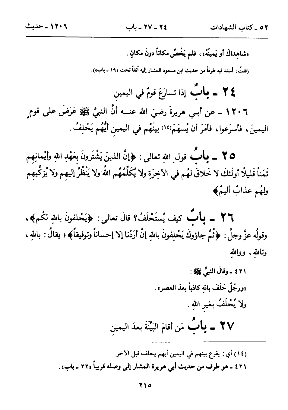 1206 - عن أبي هريرةَ رضيَ الله عنه أن النبي - صلى الله عليه وسلم - عَرَضَ على قوم اليمينَ، فاسرَعوا، فامَرَ أن يُسهَمَ (14) بينَهُم في اليمينِ أيهُم يَحْلِفُ.