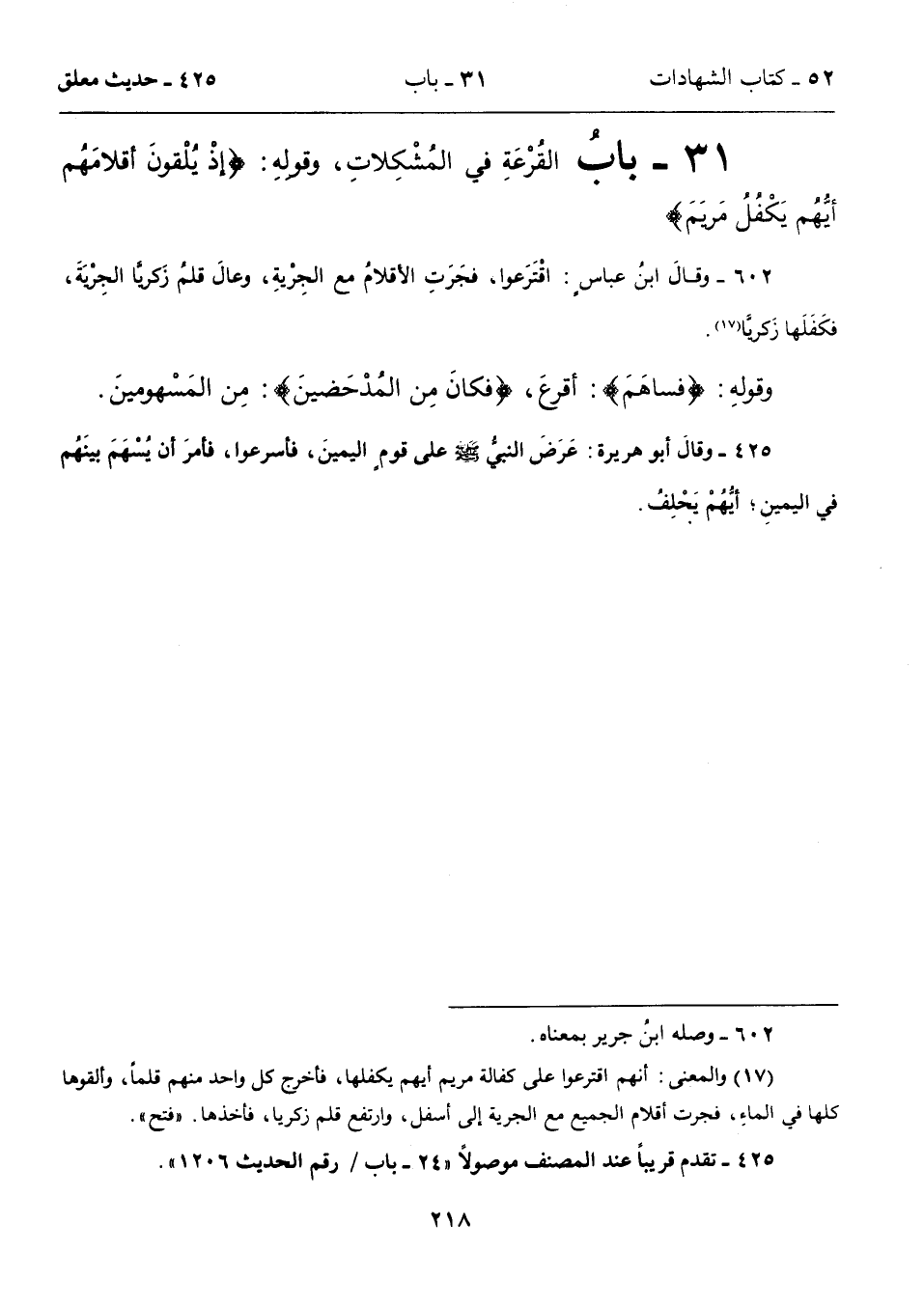 31 - باب القُرْعَةِ في المُشْكِلاتِ، وقولهِ: {إِذْ يُلْقُونَ أَقْلَامَهُمْ أَيُّهُمْ يَكْفُلُ مَرْيَمَ}