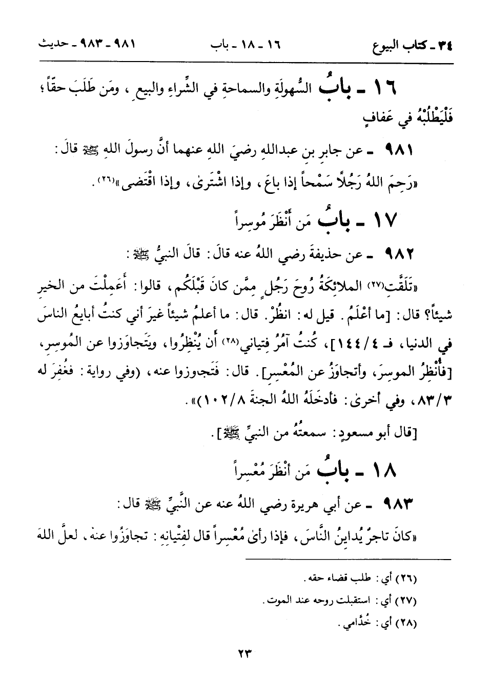"تَلَقَّتِ (27) الملائِكَةُ رُوحَ رَجُلٍ مِمَّن كانَ قَبْلَكُم، قالوا: أَعَمِلْتَ من الخيرِ شيئاً؟ قال: [ما أعْلَمُ. قيل له: انظُرْ. قال: ما أعلمُ شيئاً غيرَ أني كنتُ أبايعُ الناسَ في الدنيا، ف 4/ 144]، كُنتُ آمُرُ فِتياني (28) أَن يُنْظِرُوا، ويَتَجاوَزوا عن المُوسِرِ، [فأُنْظِرُ الموسِرَ، وأتجاوَزُ عن المُعْسِرِ]. قال: فَتَجاوزوا عنه، (وفي روايةٍ: فغُفِرَ له 3/ 83، وفي أخرى: فأدخَلَهُ اللهُ الجنةَ 2/ 108) ".