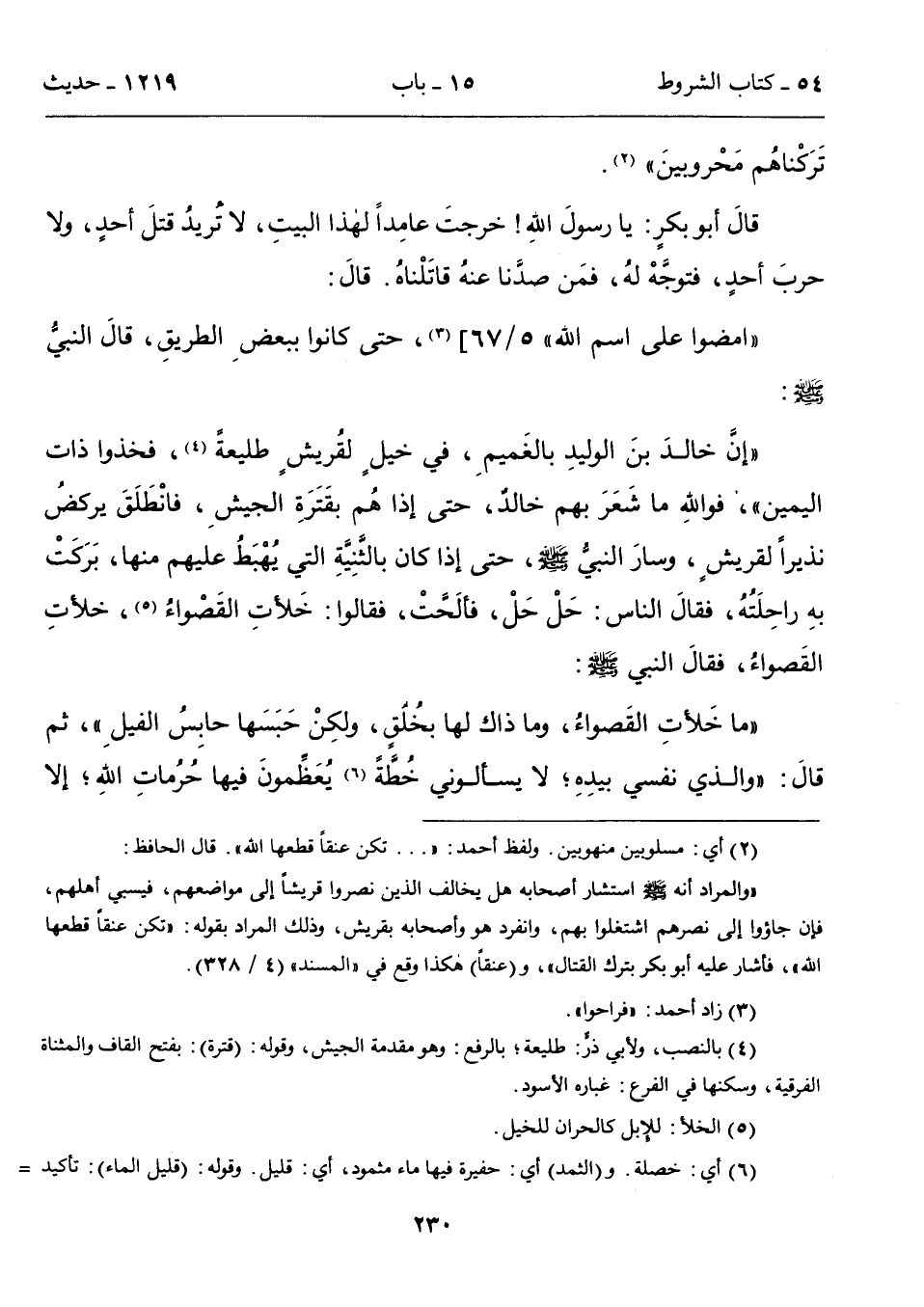 اليمين"، "فواللهِ ما شَعَرَ بهم خالد، حتى إذا هُم بقَتَرَةِ الجيشِ، فانْطَلَقَ يركضُ ذيراً لقريش، وسارَ النبي - صلى الله عليه وسلم -، حتى إذا كان بالثنِيًةِ التي يُهْبَطُ عليهم منها، بَرَكَتْ هِ راحِلَتُهُ، فقالَ الناس: حَلْ حَلْ، فالَحًتْ، فقالوا: خَلأتِ القَصْواءُ (5)، خلأتِ لقَصواءُ، فقالَ النبي - صلى الله عليه وسلم -: